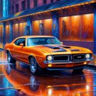 A vibrant city street at night, illuminated by neon signs. An orange muscle car splashes through puddles, reflecting colorful lights amidst a lively urban scene with onlookers.