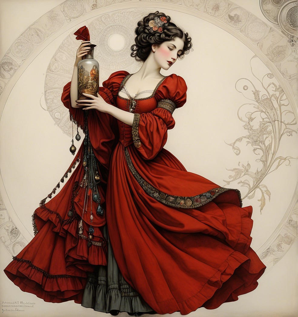 A woman in a flowing red dress and green skirt holds an ornate lantern. Her elegant hairstyle features accessories, and intricate patterns surround her, evoking a vintage, whimsical atmosphere.