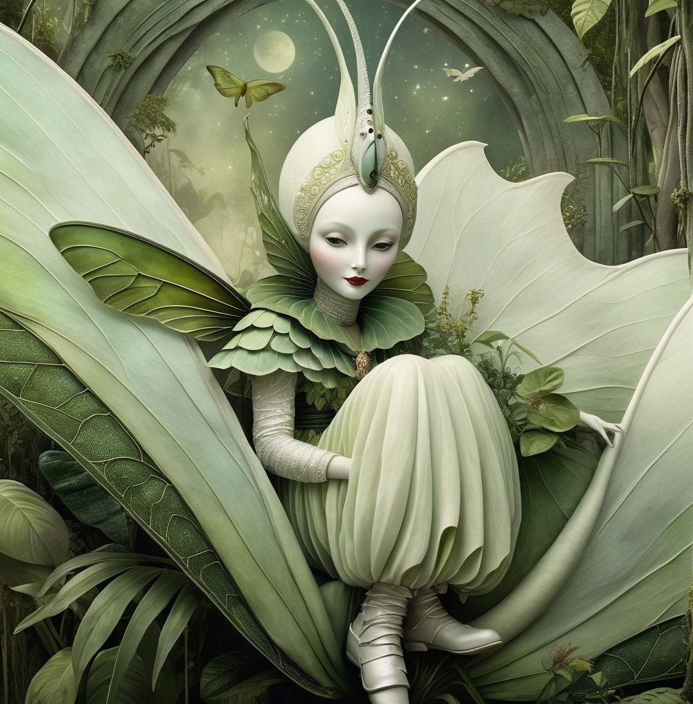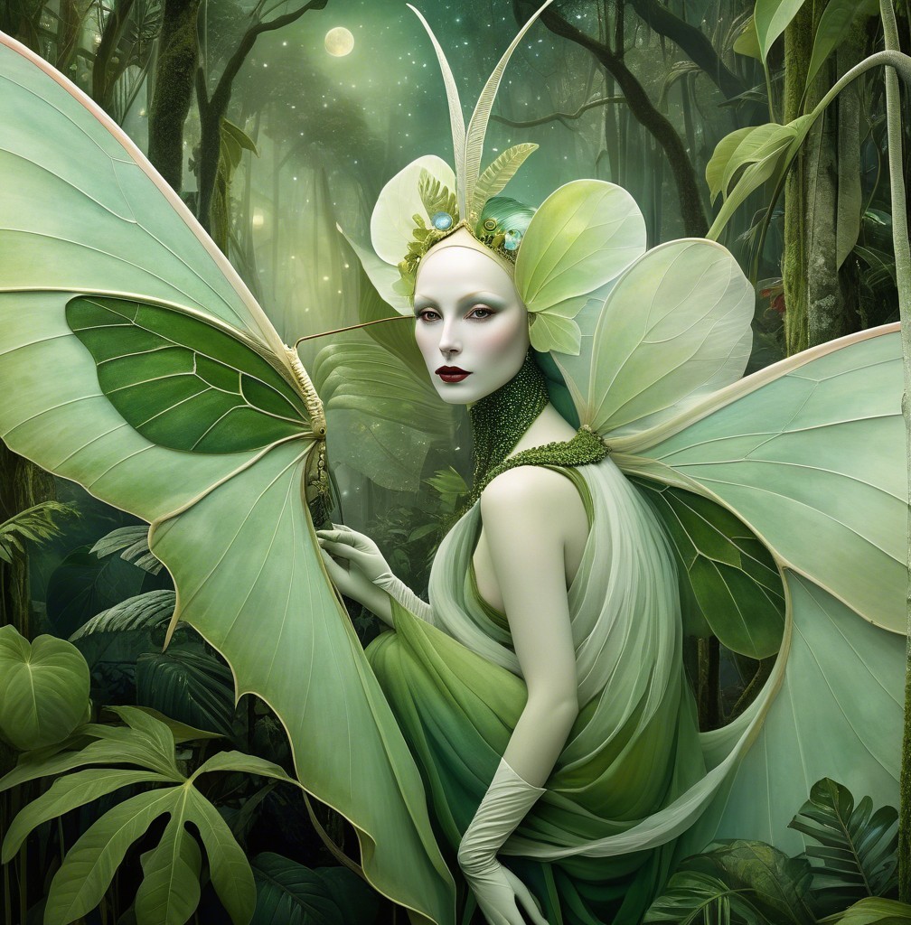 Close up, ghostly amused beautiful Amazonian Luna moth goddess in a jungle dreamscape in the style of Alexander Jansson. by Catrin Welz-Stein, Michael Parkes
