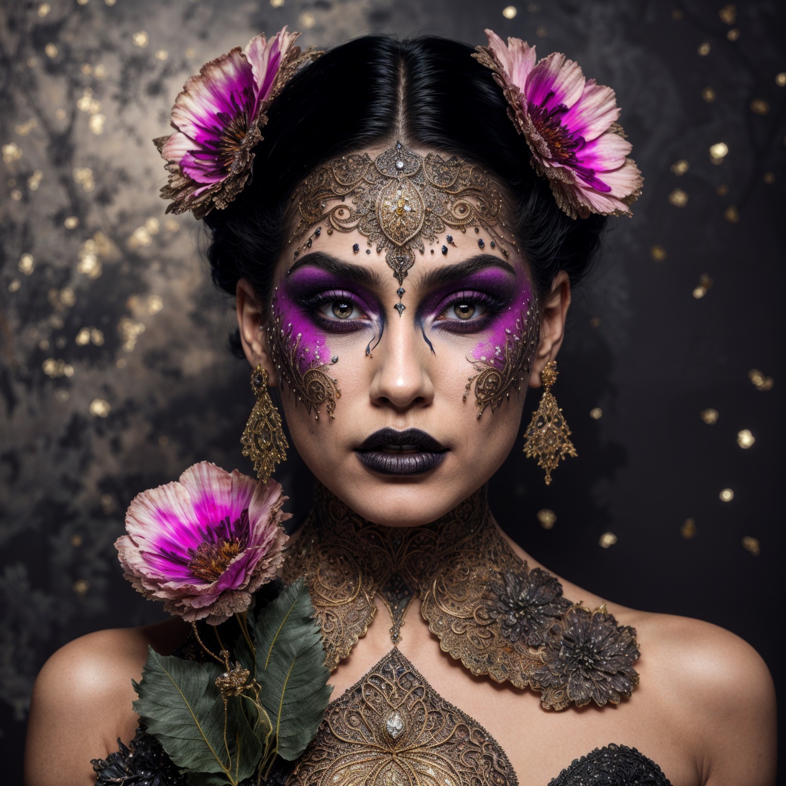 The image features a striking model with intricate metallic makeup and vibrant purple accents. Her floral accessories and dramatic highlights create a mesmerizing, artistic effect against a dark background.