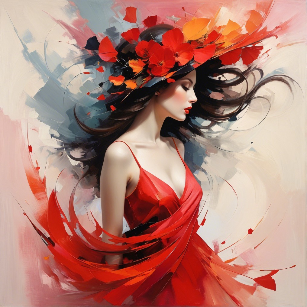 The image features a woman with flowing hair, adorned in a vibrant red dress and a large, stylish hat decorated with colorful feathers. The background is a soft blend of abstract shapes and colors.