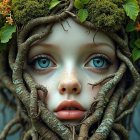 A young girl with large, expressive eyes and curly hair adorned with vibrant flowers and greenery gazes softly at the viewer, surrounded by a field of colorful blossoms.