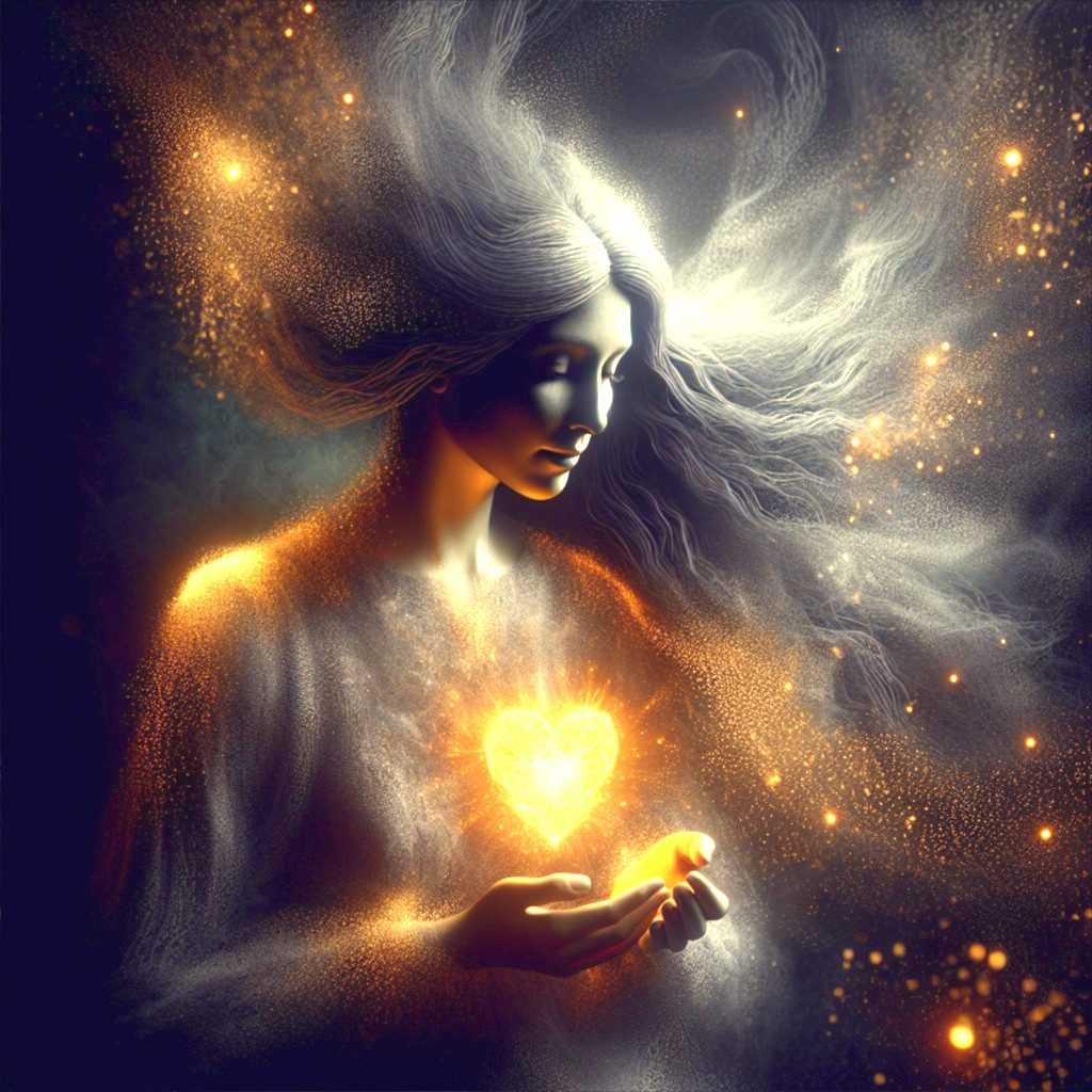 A mysterious figure with flowing hair cradles a glowing heart in her hands, surrounded by ethereal wisps of light and shimmering particles, evoking a sense of warmth and wonder.