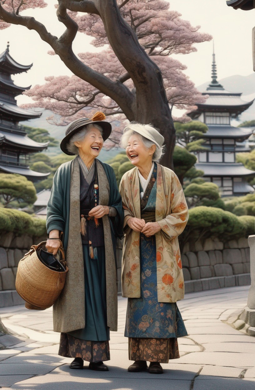 Two joyful elderly ladies in traditional attire are laughing together in front of a serene Japanese temple setting.