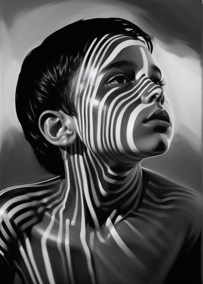 + Prompt:black and white portrait, young Cosmic boy, Optical Illusion, dazzle camouflage, insanely detailed, intricate & diverse line work, symmetry,, precision, perfectionism in the style of Peter Kogler. No watermark, no frame.