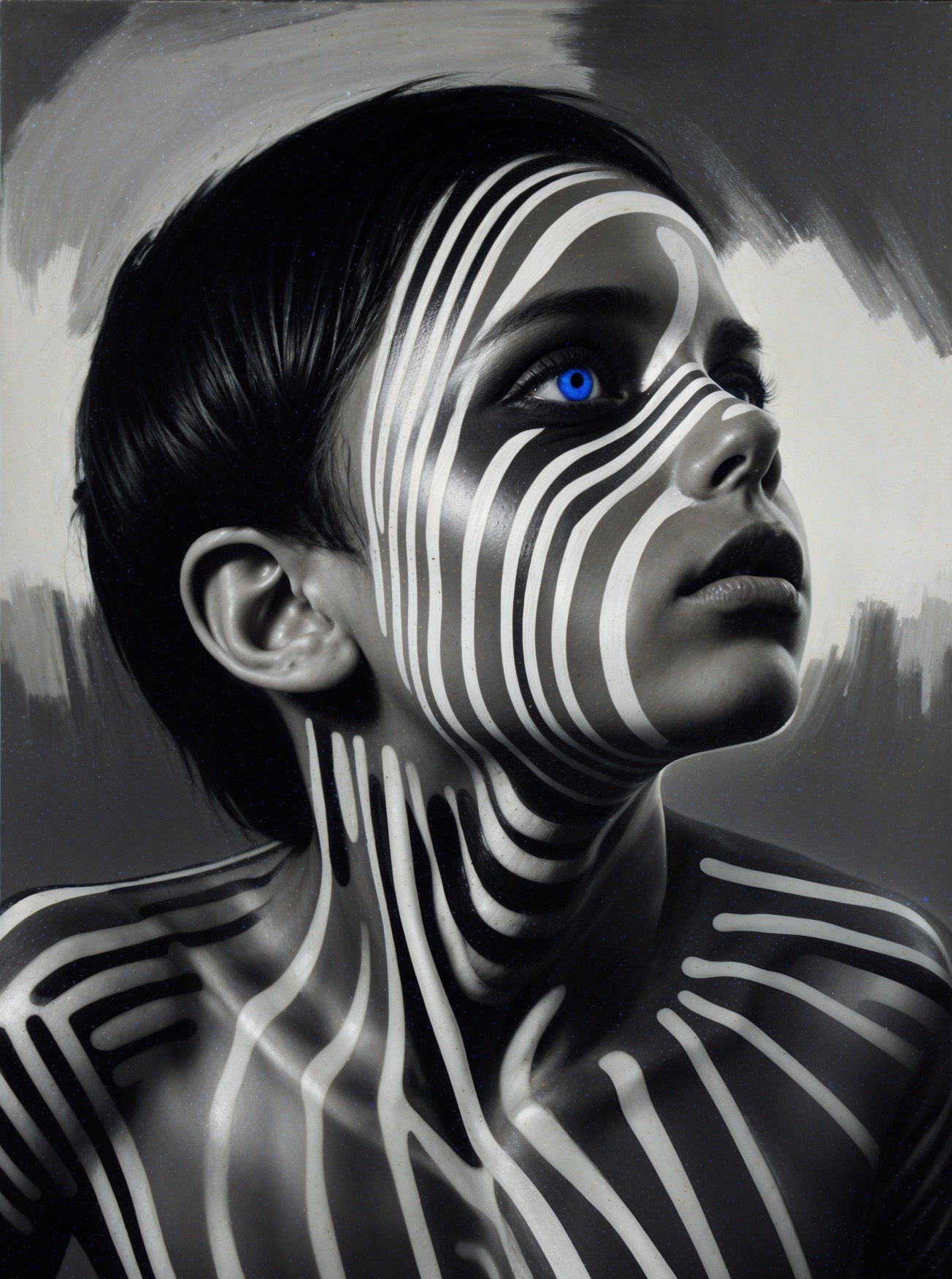 Prompt: boy in stripe body paint, black and white impasto oil painting, selective blue eyes, dark, abstract, ominous, style of Dave McKean, Christopher Bucklow, Jeremy Mann and Stephen Gammell
