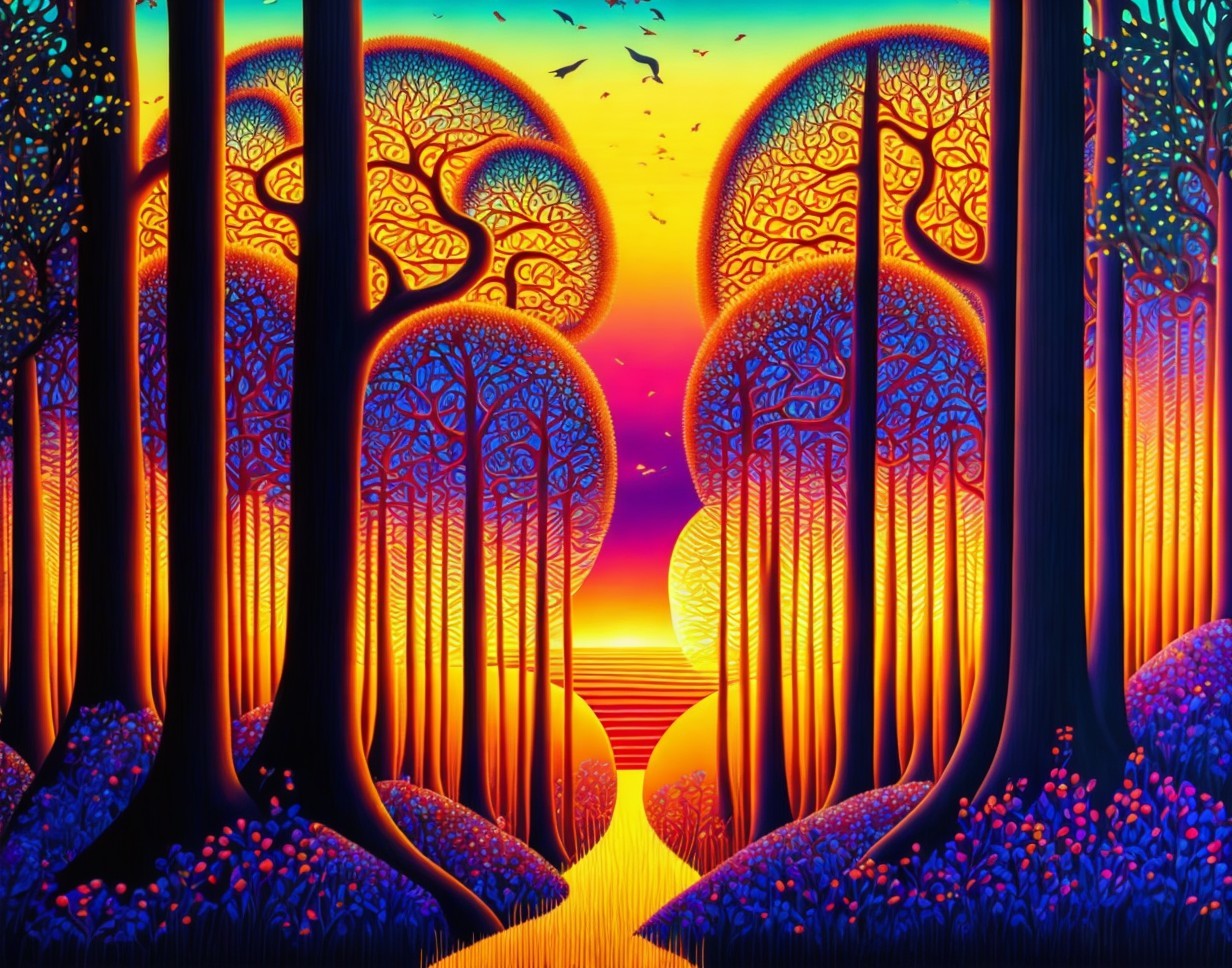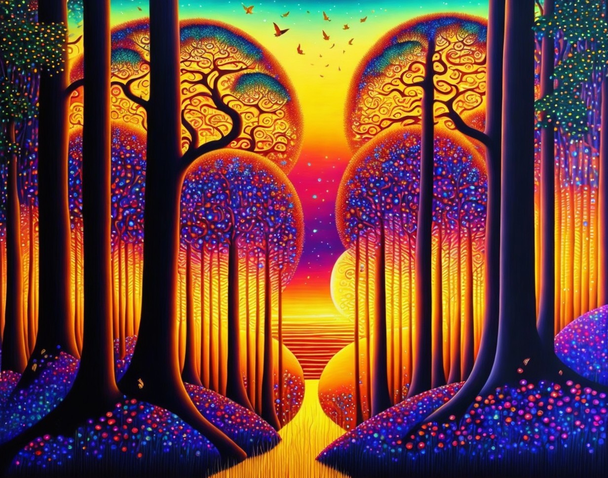 Create an image of a vibrant, surreal forest at sunset. The forest is composed of stylized trees with smooth, thick trunks that transition from deep orange near the roots to dark navy blue towards the top. The canopy of the trees forms perfect semicircles, filled with intricate swirling patterns that mimic the appearance of filigree and the convolutions of a brain, glowing with a harmonious mix of blues, purples, and a touch of orange reflecting the sunset. Some trees have smaller, circular foliage clusters around their trunks, adorned with the same swirling patterns and glowing dots. The ground is dotted with small luminescent spots in various shades of blue and purple, reminiscent of bioluminescent fungi, leading to a warm, bright horizon where the sun sets in a gradient of yellow, orange, and red, against a skyline subtly transitioning to a dark blue at the top. The sky is free of clouds and features a few birds silhouetted against the bright sunset. The overall atmosphere is one of magical realism, with a vivid, almost neon color palette.
