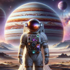 An astronaut stands on a rocky landscape, gazing at a stunning view of giant planets in a colorful sky, surrounded by ethereal pink foliage and distant mountain ranges.