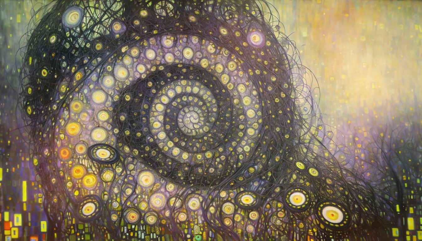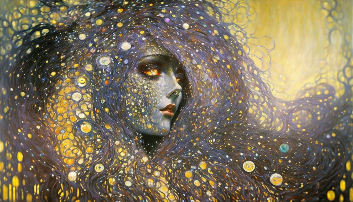 An artistic portrayal of a woman with flowing dark hair interspersed with vibrant yellow orbs against a muted background.