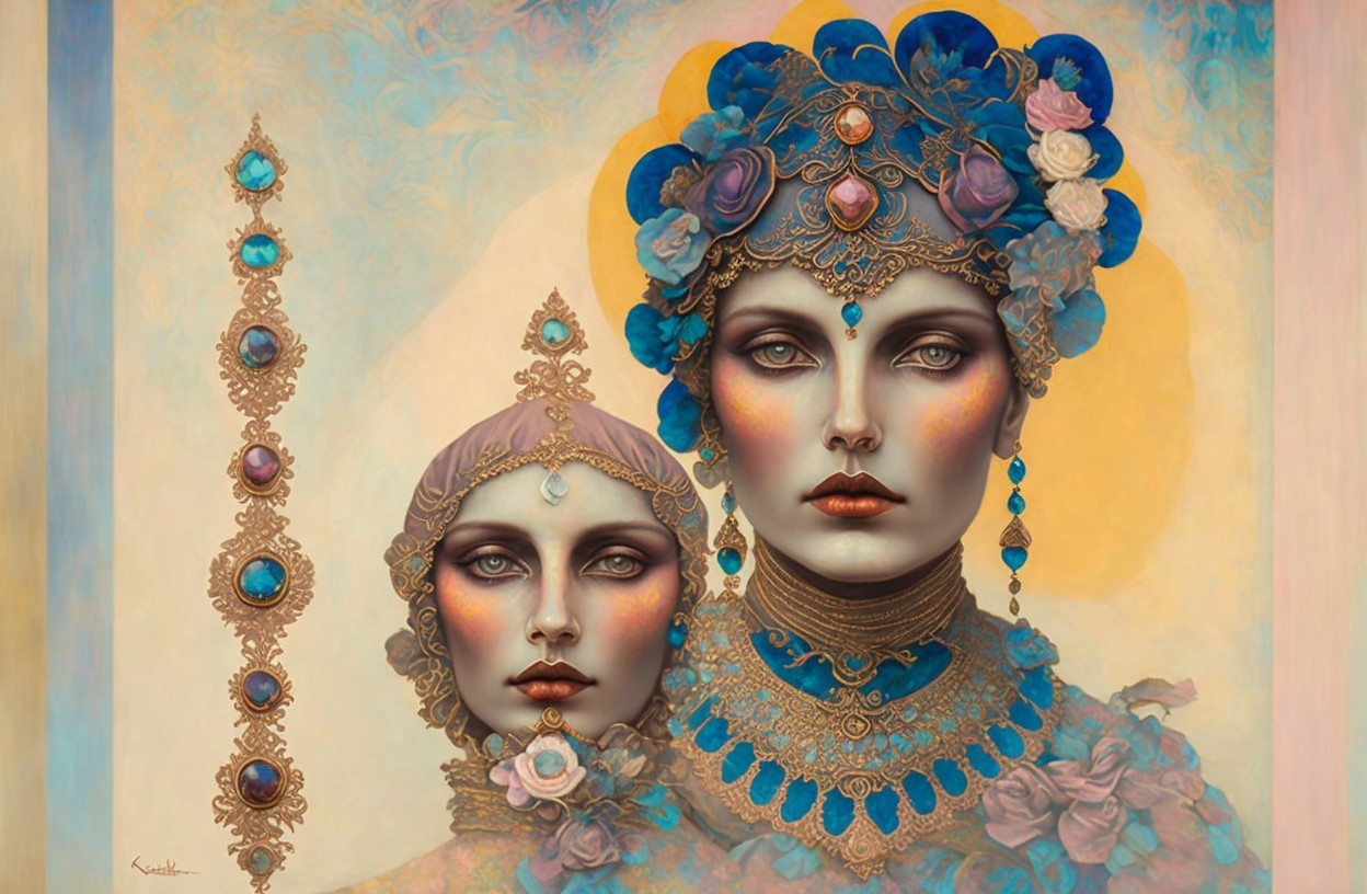 An artistic depiction of a woman with a blue headscarf, holding a teapot, against a striped background.