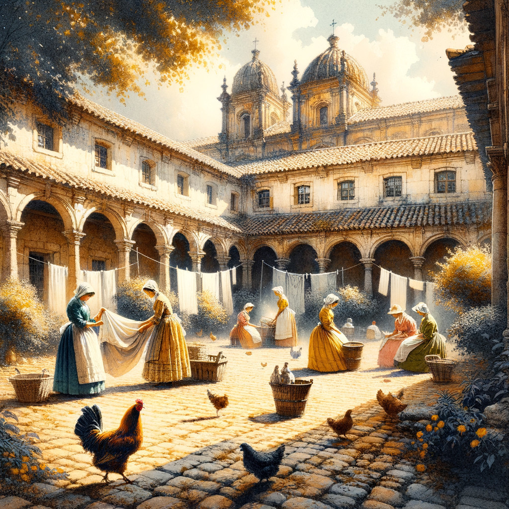 A serene 1800s courtyard comes to life with women hanging white laundry and hens strolling. The warm ambiance, dappled sunlight, and intricate details create an ethereal, dreamy atmosphere.
