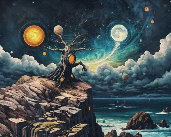 A surreal scene features three figures: one cycling, another holding a stick in a storm, and a third seated with an umbrella, all set against a dark, cloudy sky with lightning.