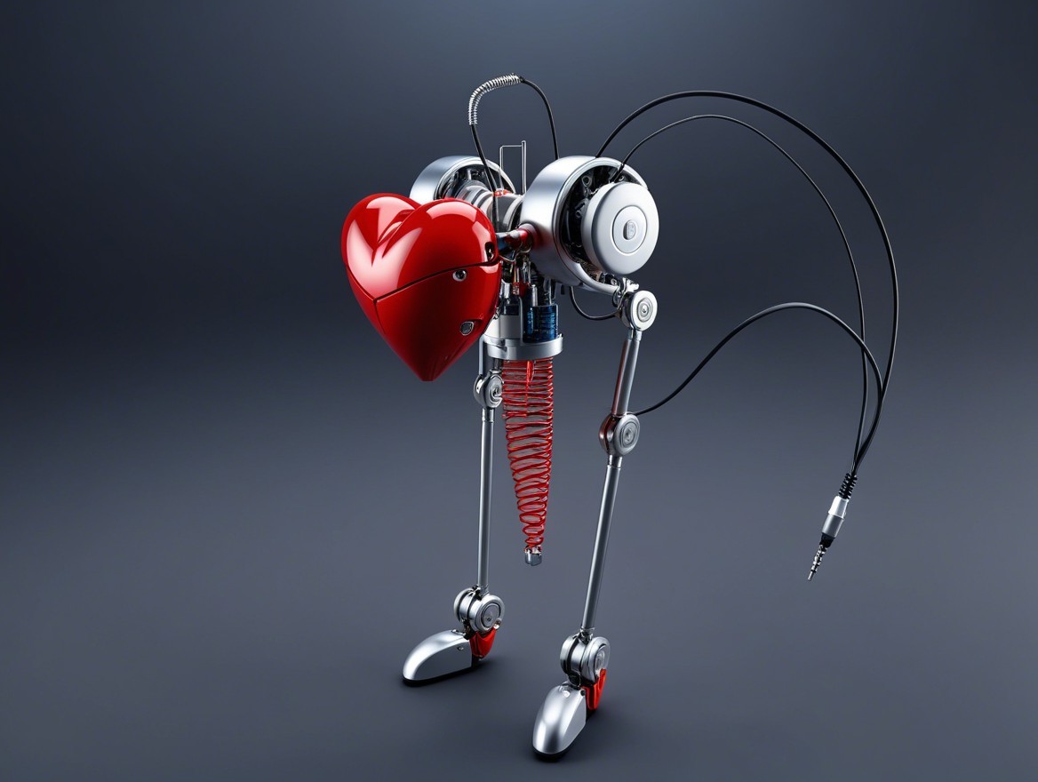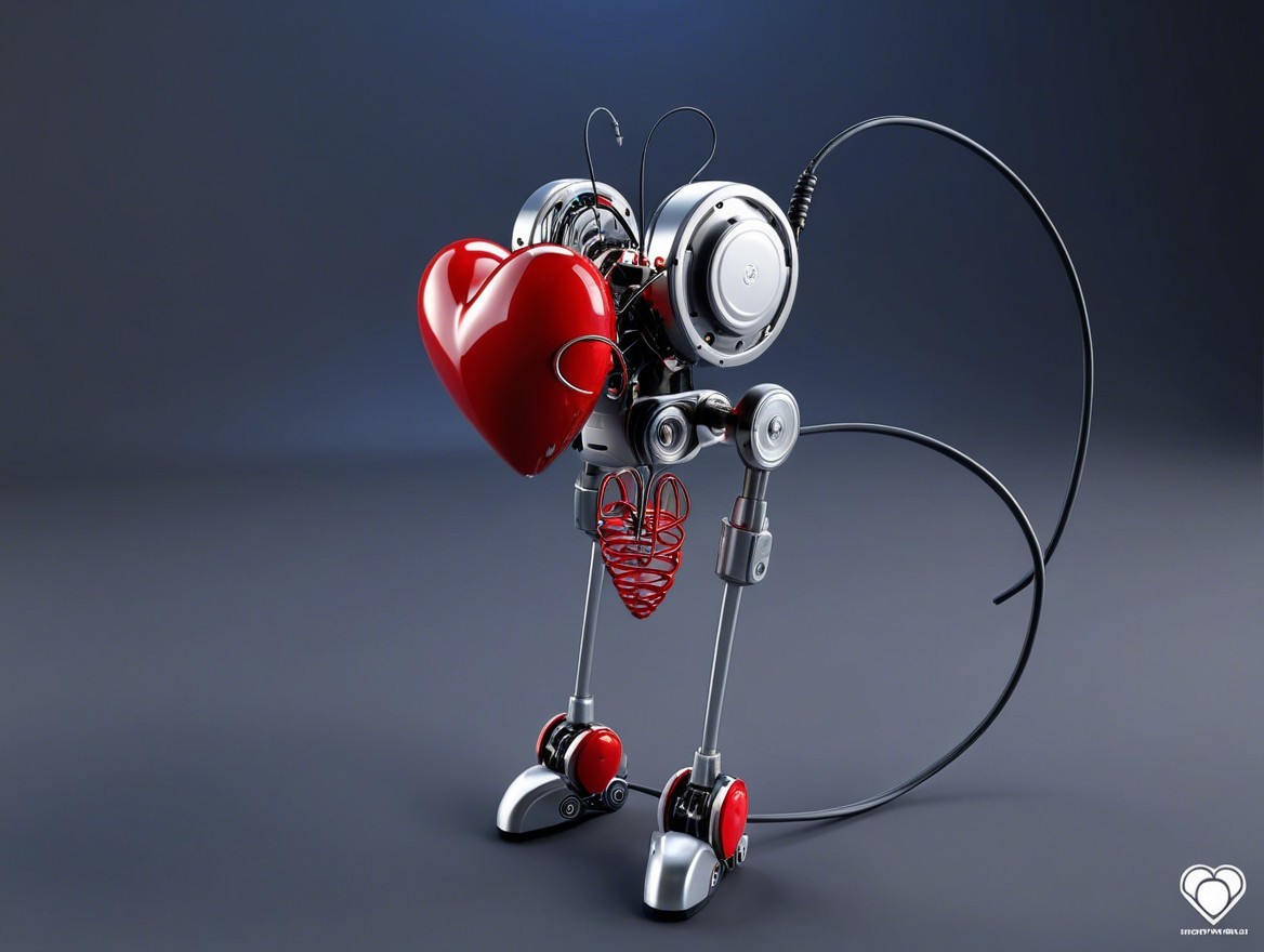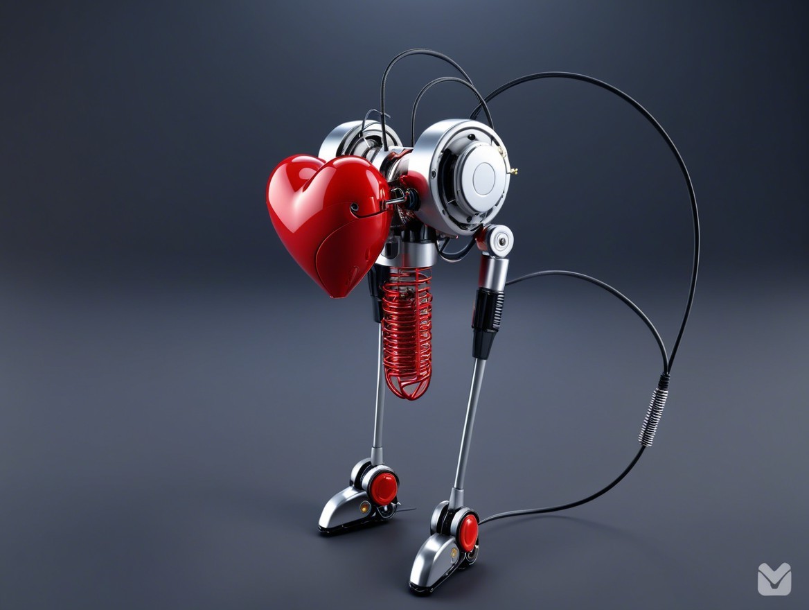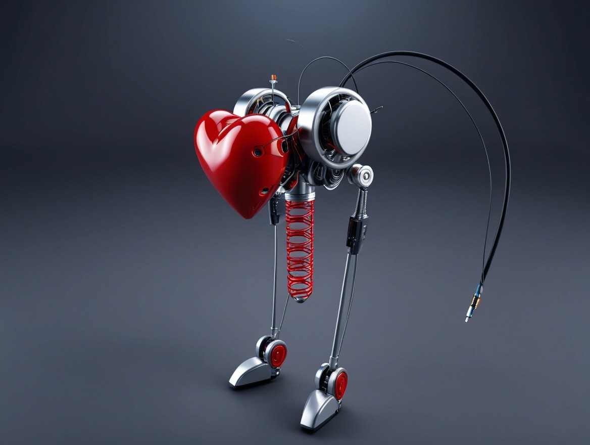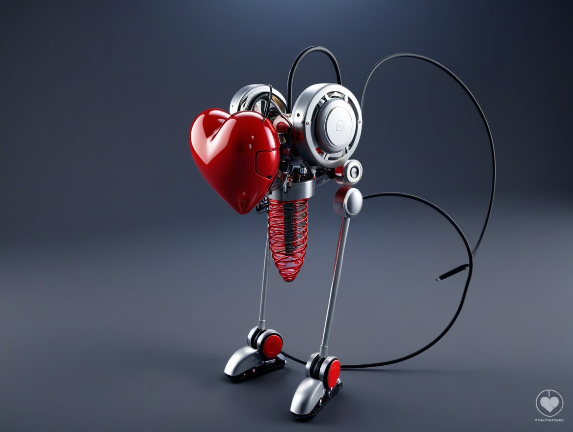 A whimsical robot with a glossy red heart for a body, silver mechanical limbs, and playful springs for legs, exuding a blend of technology and affection in a sleek, modern design.