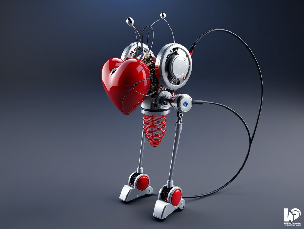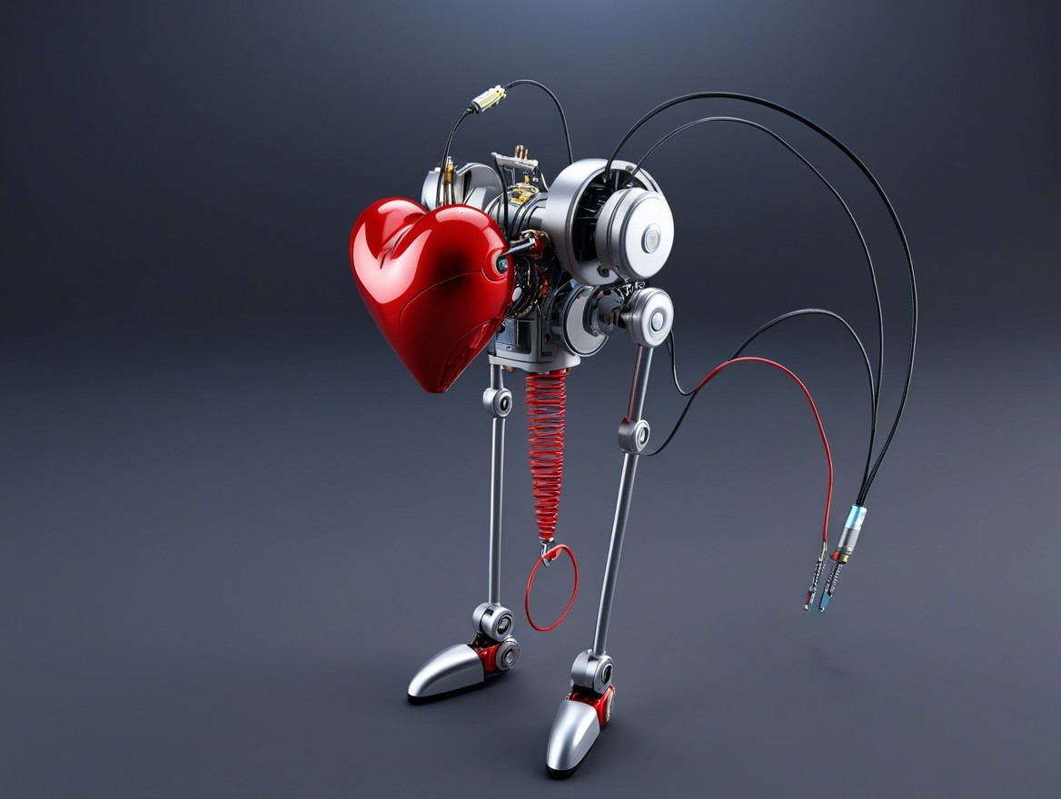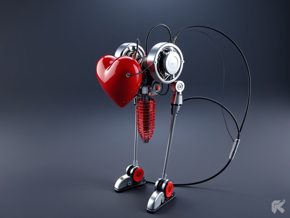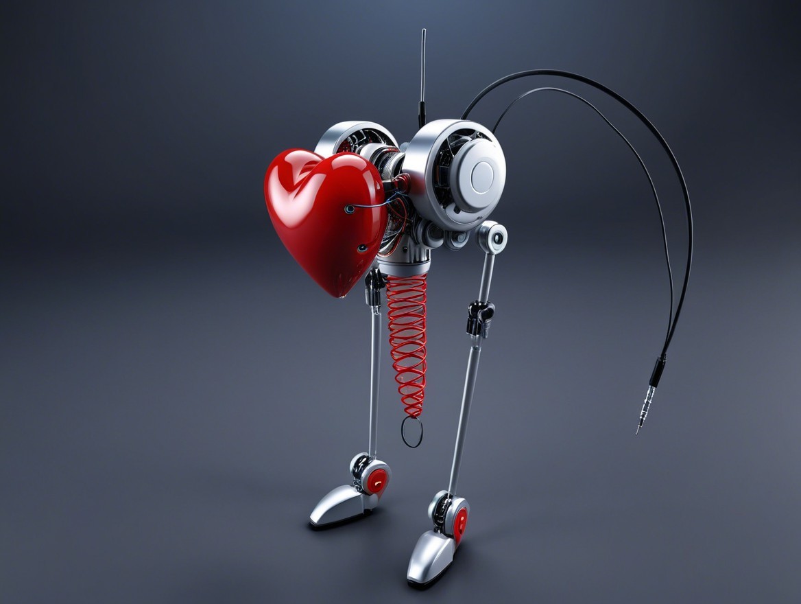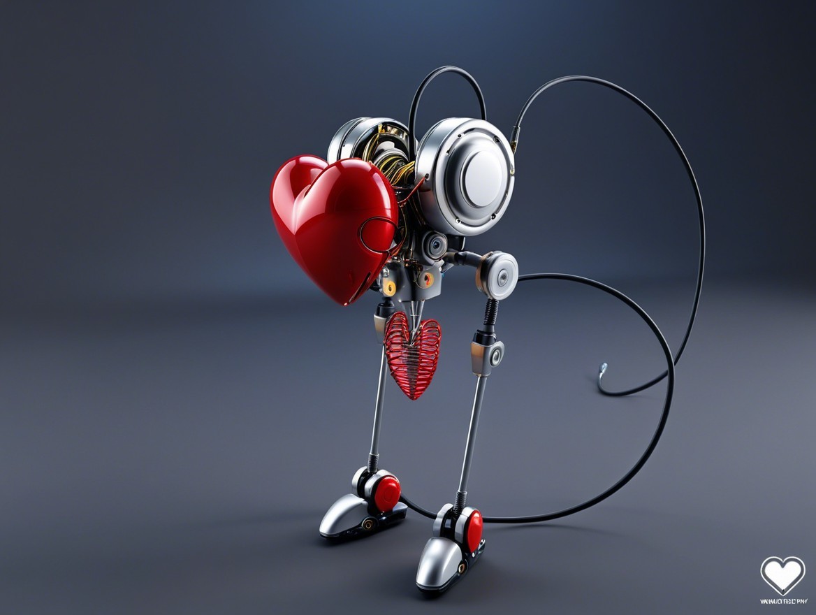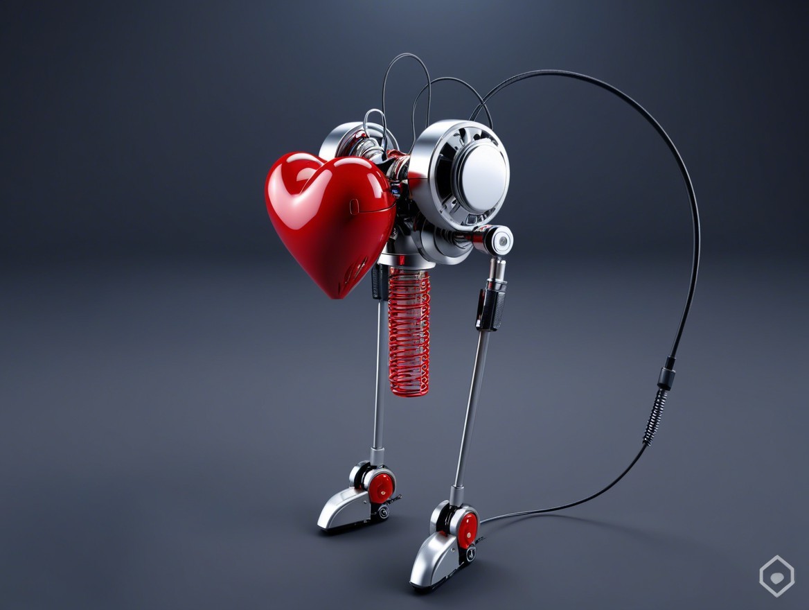 A whimsical robot with a glossy red heart for a body, silver mechanical limbs, and playful springs for legs, exuding a blend of technology and affection in a sleek, modern design.