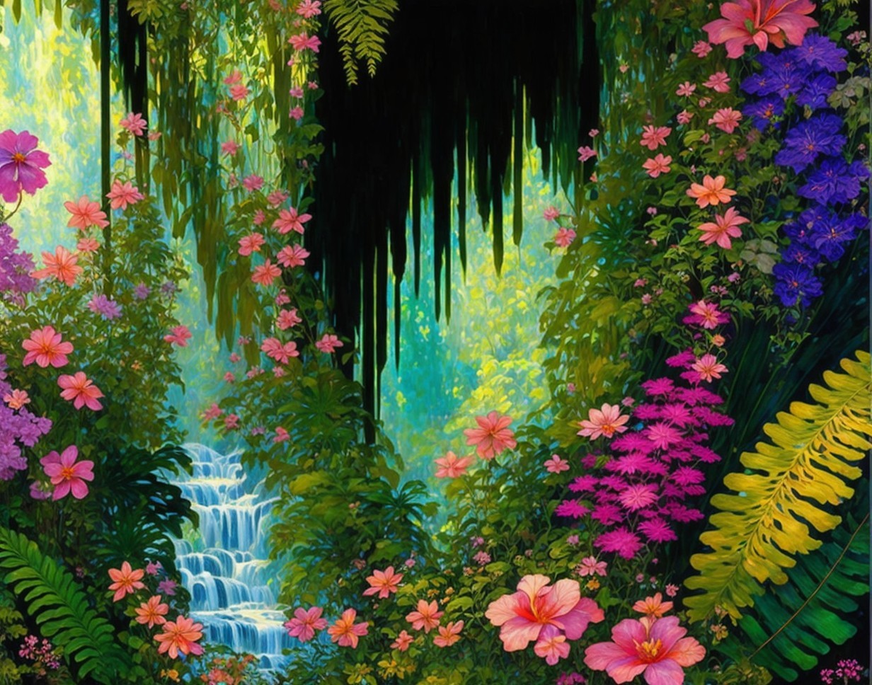 3D watercolor patchwork, fantastic wide view, spectacular sunrise over a sparkling rushing Rainforest river, brightly colored tropical flowers, lacy green plants, delicate ferns, satiny, high quality, shimmering, elegant, with vibrant spectacular colors, elegant, highly detailed, glistening magic style, by Alphonse Mucha, with elements in the style of Gustav Klimt, and elements in the style of Jan Toorop