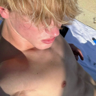 A young man with blonde, tousled hair lies on a striped background. He has a confident expression, wearing a casual outfit that showcases his toned physique and chiseled features.