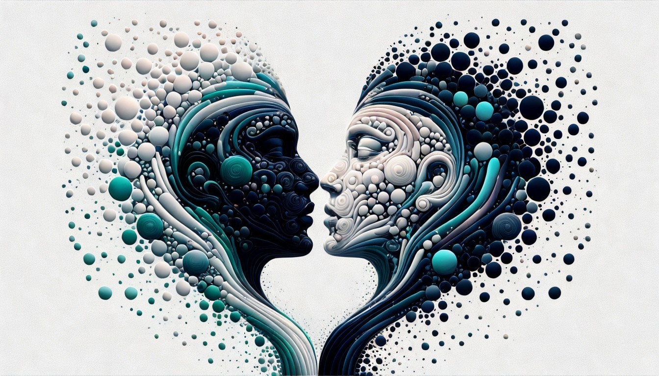 Prompt: "Digital artwork, glossy white surface, white background, art clearly depicts a classically handsome masculine man's face & clearly depicts a classically beautiful woman's face on the verge of kissing, faces almost touching, key visual – they are in slight yin & yang position which means they are both in sideview profile but the tops of their heads are in opposite directions, unyielding anatomical accuracy, contrast palette with deep blacks, dark blues, dark teal & vibrant whites, pale lilacs, that mimics the sublime effect of dynamic movement, bubbles, intricate patterns & blending of colors, kinetic pointillism & layering & stacking of 3D textured pointillism, mark-making techniques, linework & unique granular clusters, sinuous, yet, chunky, precise & varied shapes, including hearts, create fascinating textured tracery of parallel running lines, in black, white, varied gray shades, indigo-blue, dark-blue layered shades, dark teal , trending on artstation, sharp focus, studio photo, intricate details, , by Greg Rutkowski, senuous, elegant, masterpiece insanely-detailed ultra-detailed extreme-detailed hyper-detailed DALI Victor Vasarely, Michael Cheval"