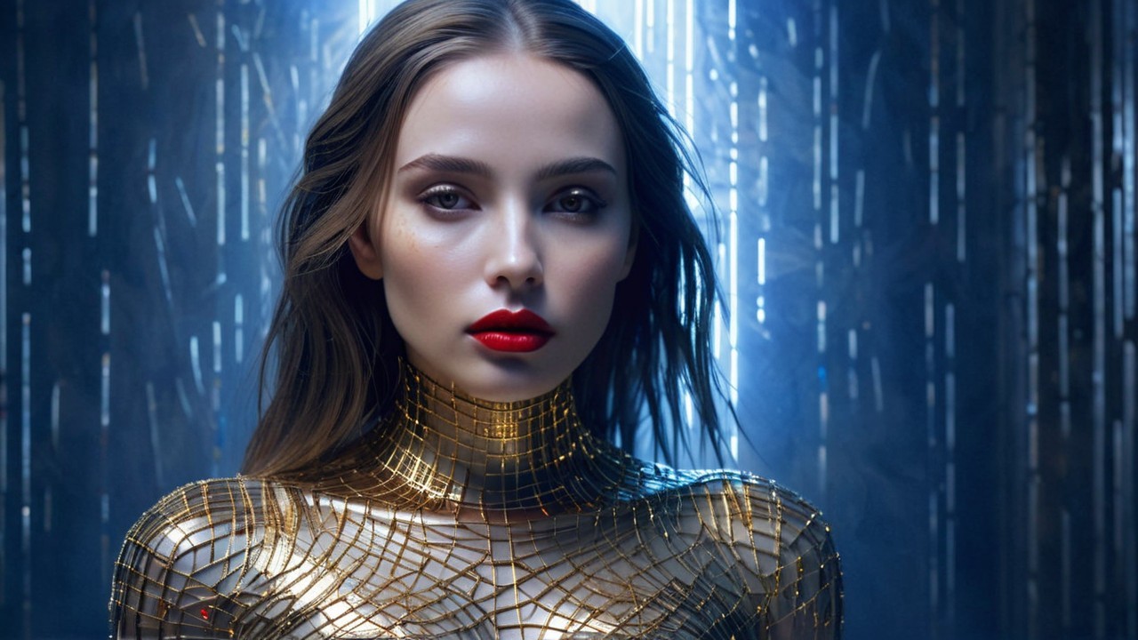 A striking portrait of a woman with a chic bob hairstyle, showcasing bold red lips and wearing a glittery gold and black outfit. The background features an elegant, illuminated texture.