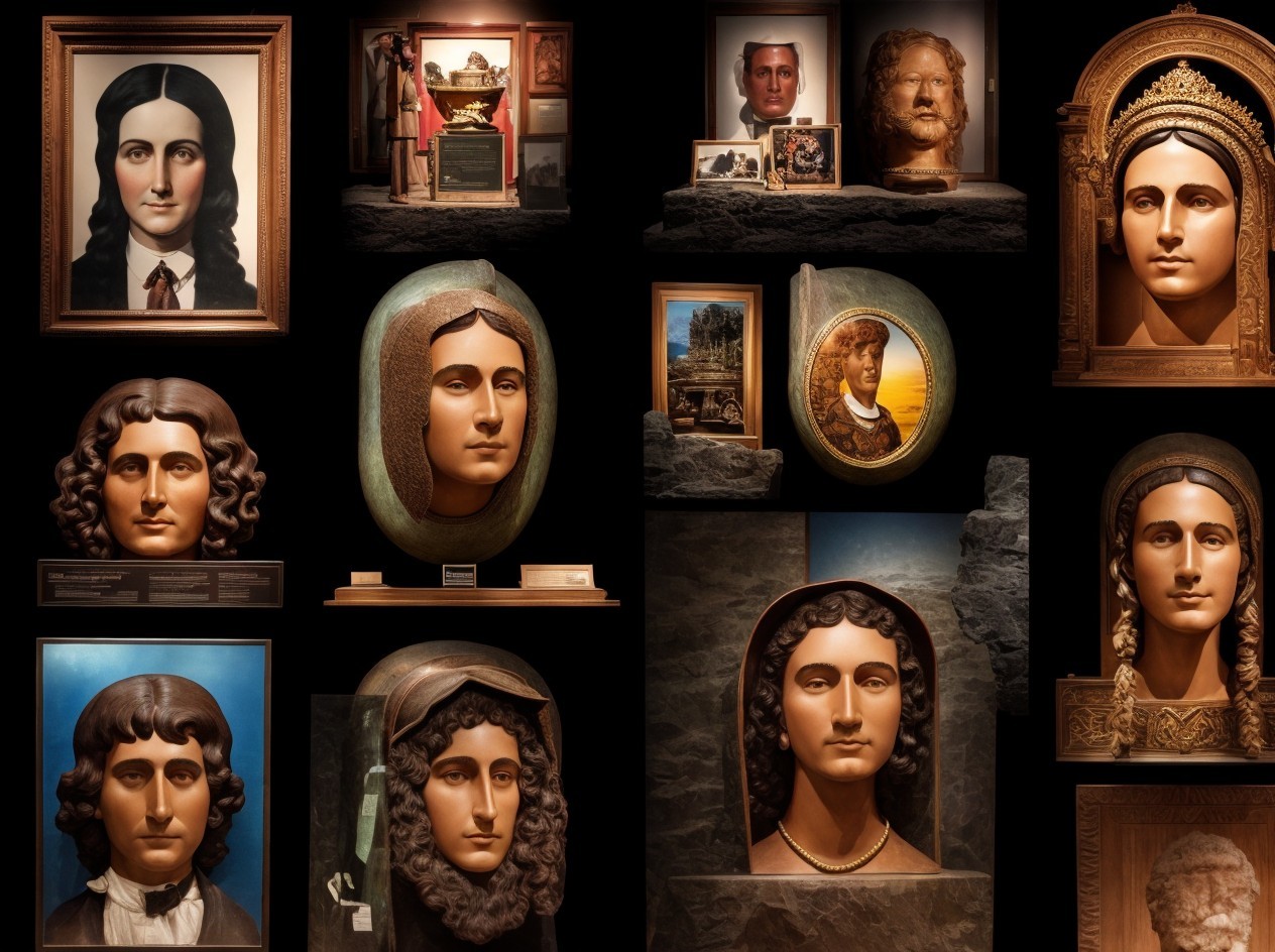 A top-down, front-facing, full shot of a collection of 12 paintings or sculptures or busts of women's faces, all on a dark background.