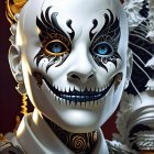 A striking portrait of a person with elaborate makeup, featuring bold black and white designs, intricate accessories, and vibrant blue eyes, exuding a captivating and mystical aura.