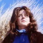 A woman with long, wavy auburn hair stands against a backdrop of tall, dry grass, gazing thoughtfully into the distance. She wears a blue top and a dark coat, exuding confidence.