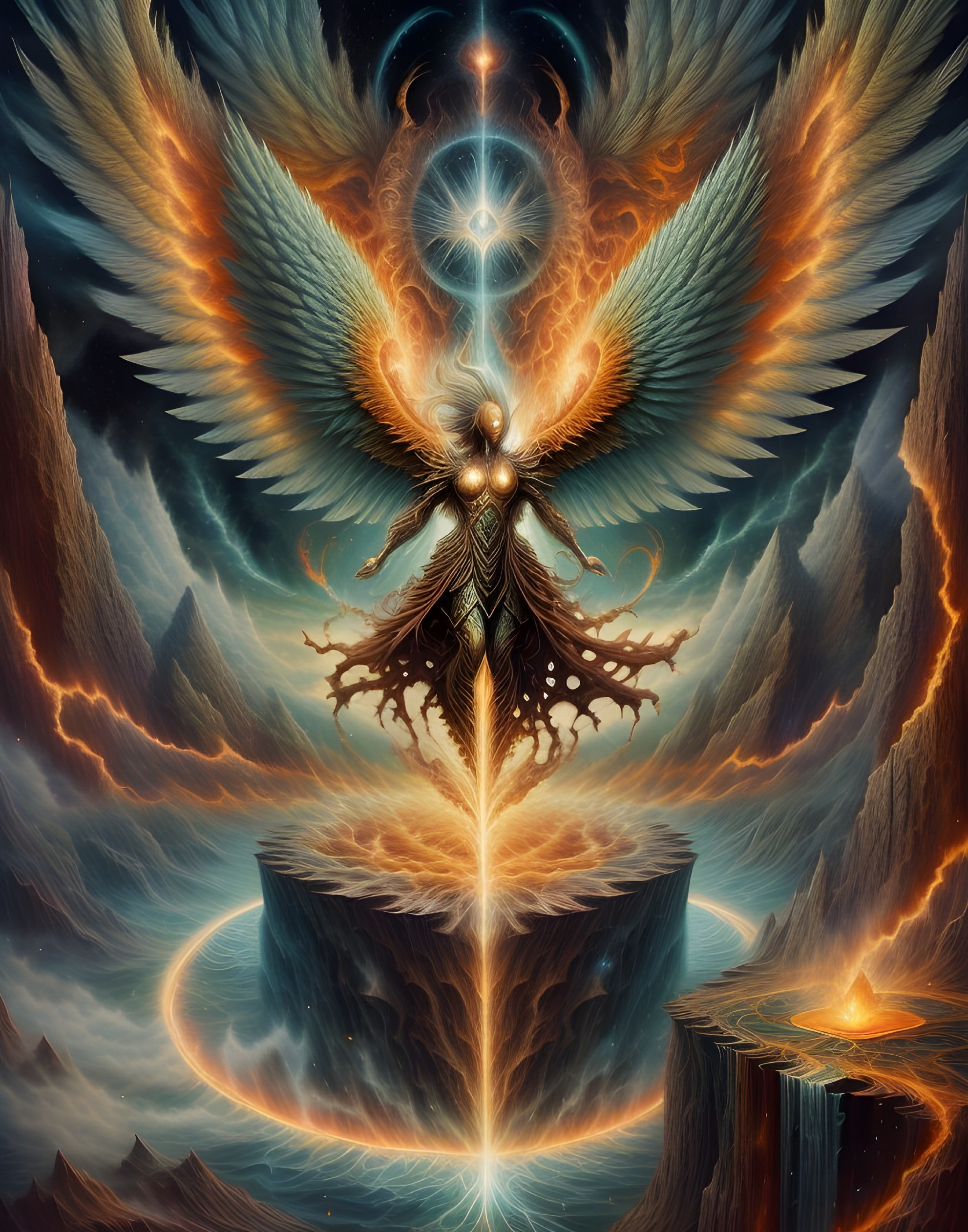 A majestic, angelic figure with expansive wings hovers above a surreal landscape, emanating glowing energy and encircled by mystic symbols.