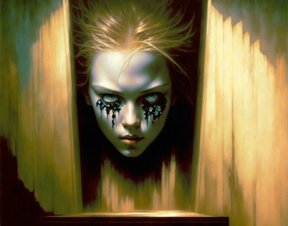 A haunting image of a figure with eerie black tears, golden hair, and an intense gaze emerging from shadows between two yellow curtains.