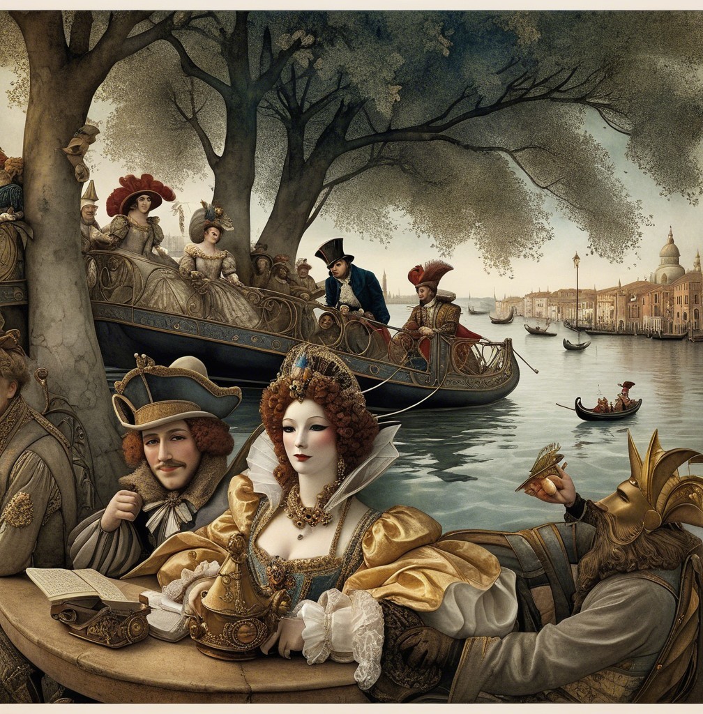 Close up, Venetian carnival festival , in the style of Alexander Jansson. by Catrin Welz-Stein, Michael Parkes. By Rob Gonsalves, Markus Pierson. Bronze tones.