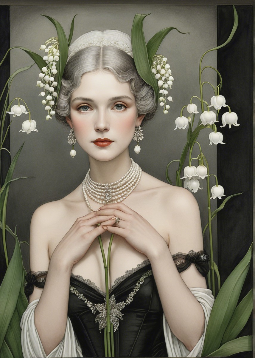 Lots of lilies of the valley. Magical realism, illustration, clear and clean face, hand colored, wateracolor and ink, ultra detailed, dreamer with open eyes can't wake up inspired from Michael parkes, Ashley Barron, Amy Sol and Aubrey Beardsley,