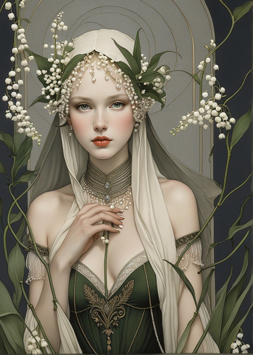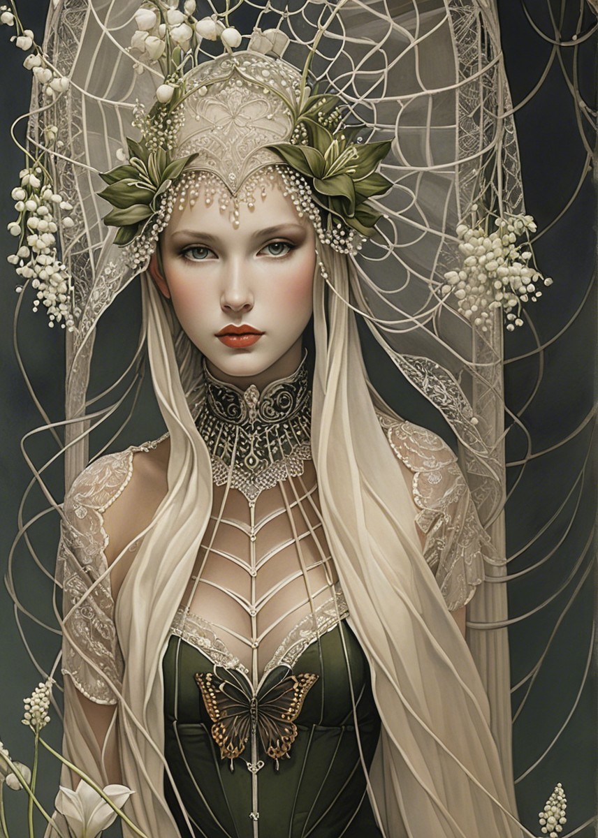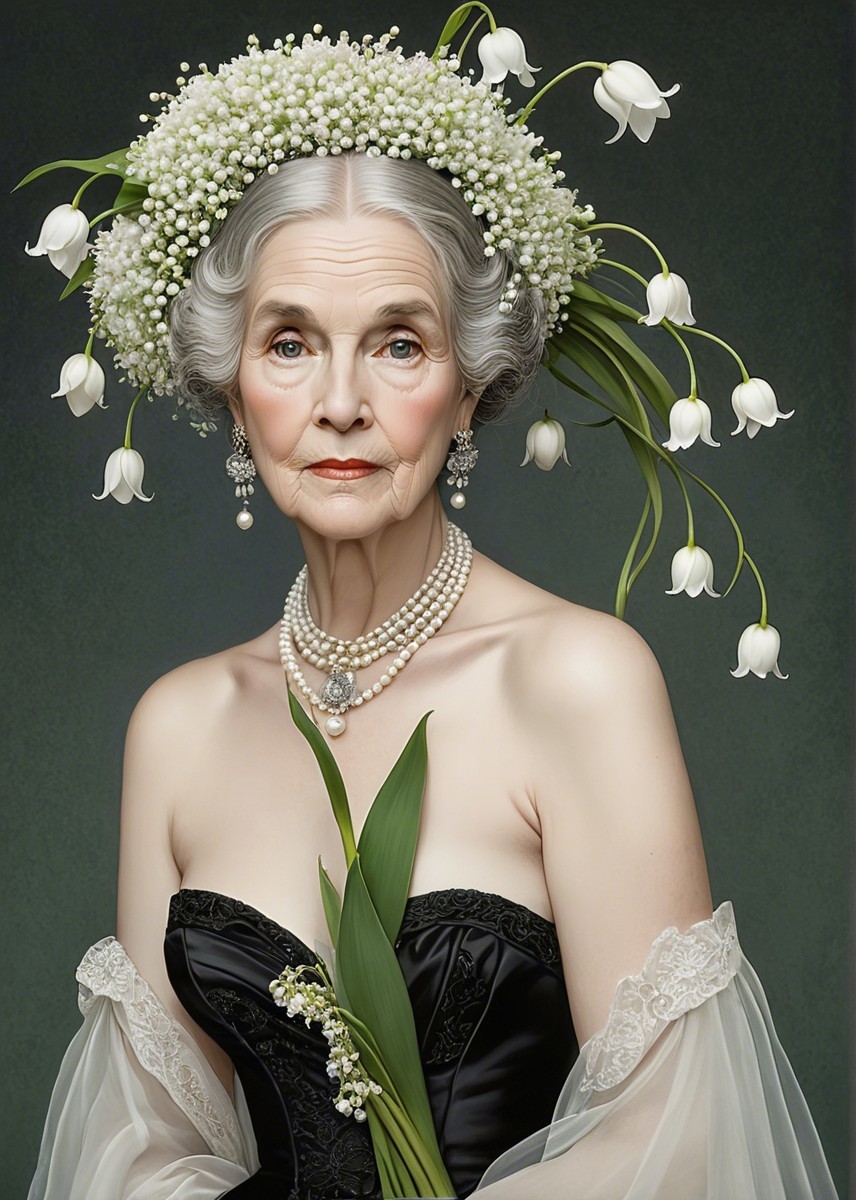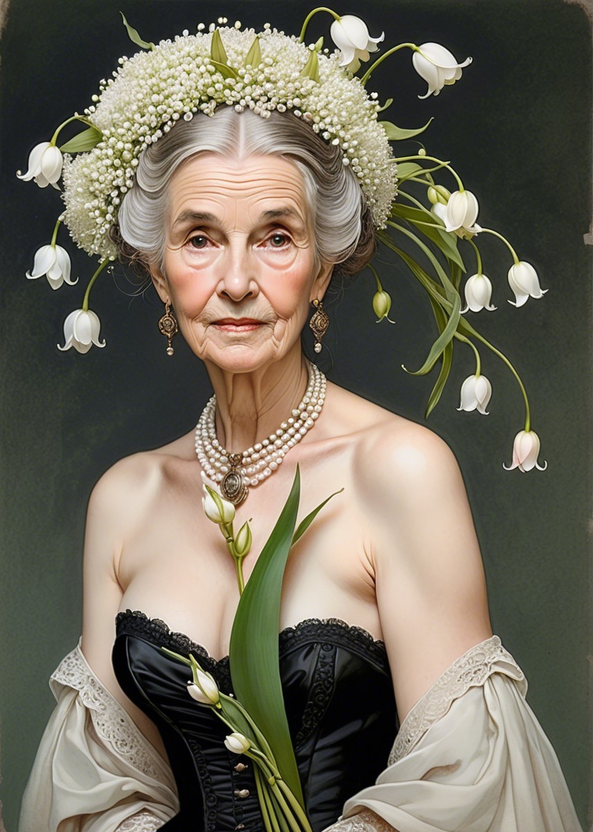 Little old lady, bridal portrait, Lots of lilies of the valley. colored ink drawing, watercolor artwork on old withered paper, vintage, by Caravaggio, Fragonard, Anton Pieck, pale colors, high detail, intricately detailed, hyperdetailed volumetric lighting, art nouveau graphic steampunk ., whimsical, beautiful, poignant, touching. colors blush bronze, black. soft watercolor extra water in magical realism by Annigoni, Egon Schiele, Milo Manara, Botticelli, Catrin Welz-Stein, Jean Metzinger, Klimt, perfect eyes, perfect handsface, highly detailed, complementary colors, hyper detailed. Watercolor and ink splatter, dynamic pose, dark blue background, unreal engine, alphonse mucha, global illumination, detailed and intricate environment Beautiful woman in the style of Pino Daeni Dorota Piotrowiak Edward Gorey, junji ito, klimnt , gold leaf color, silver leaf color beautiful dynamic lighting high definition hdr * Random prompt award winning Max Ernst ultra detailed 4K 3D Texture