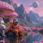 A surreal landscape features a polar bear beside an astronaut by a vibrant, reflective lake. Giant mushrooms tower above, set against a cosmic background with Saturn and colorful mountains.
