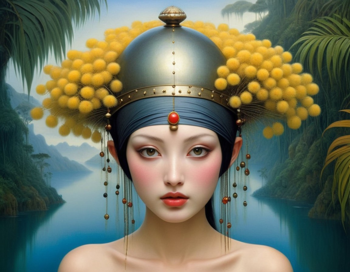 An artistic portrait of a woman with an elaborate headpiece, set against a serene, tropical background.