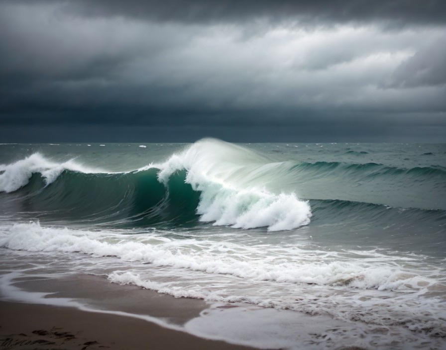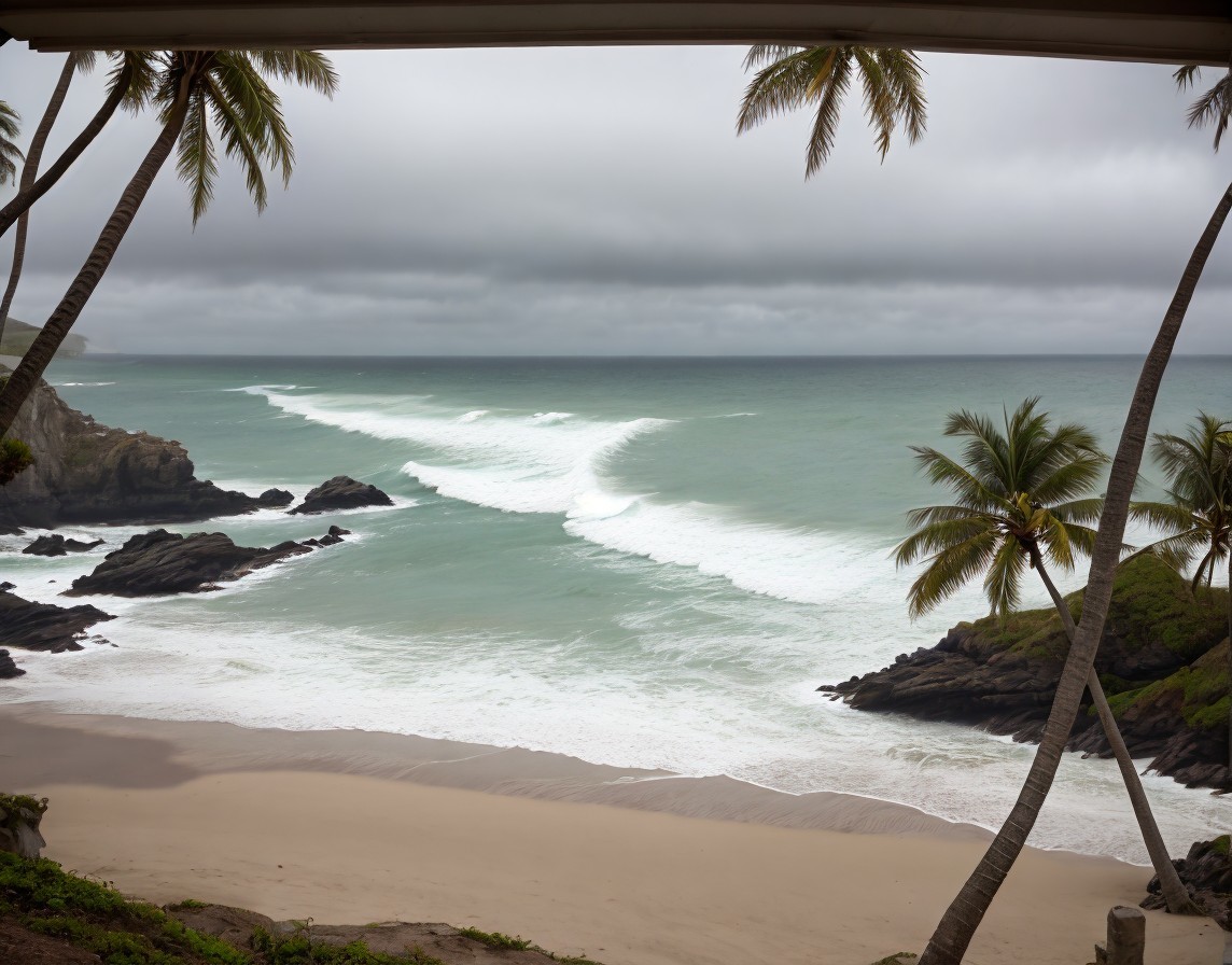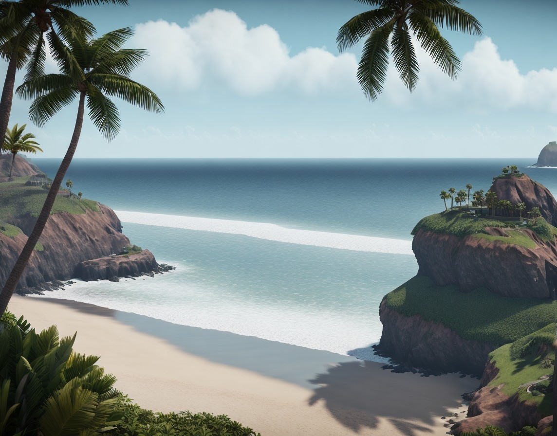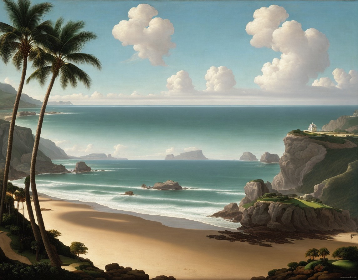 A 19th-century painting depicting a serene coastal scene with palm trees, rocky shores, white waves, sailboats in the distance, and a clear sky with fluffy clouds.