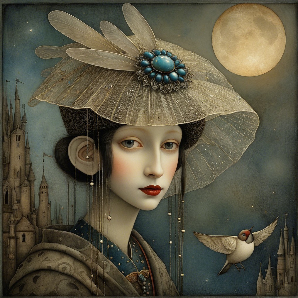 A mystical portrait of a woman with a feathered headdress and a blue gemstone, set against a moonlit sky. She gazes thoughtfully, accompanied by a white dove and an ethereal castle.