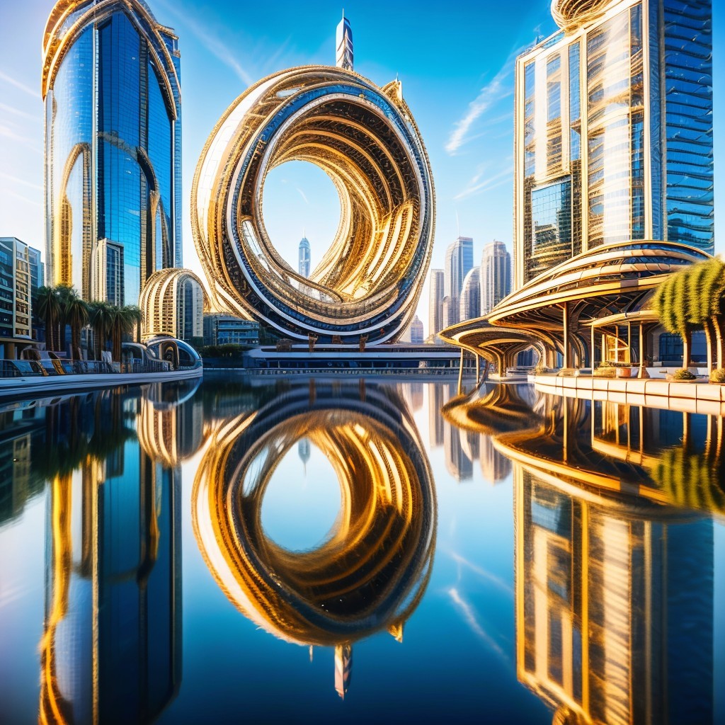 A futuristic cityscape with distinctive loop-shaped buildings reflecting on a tranquil water surface amidst other skyscrapers.