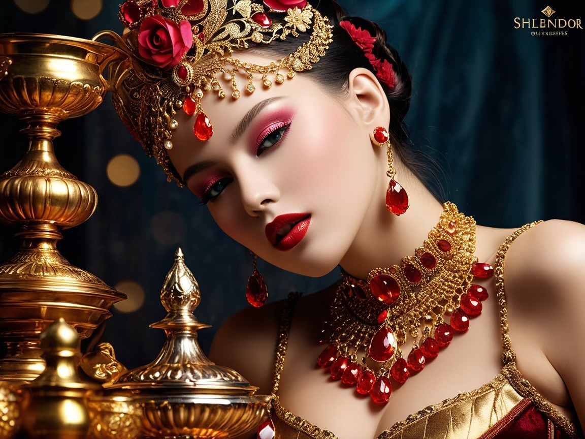 A glamorous woman adorned with intricate gold jewelry and vibrant red gemstones. Her makeup is bold, featuring striking pink eyeshadow, framed by dark hair decorated with roses, exuding elegance.