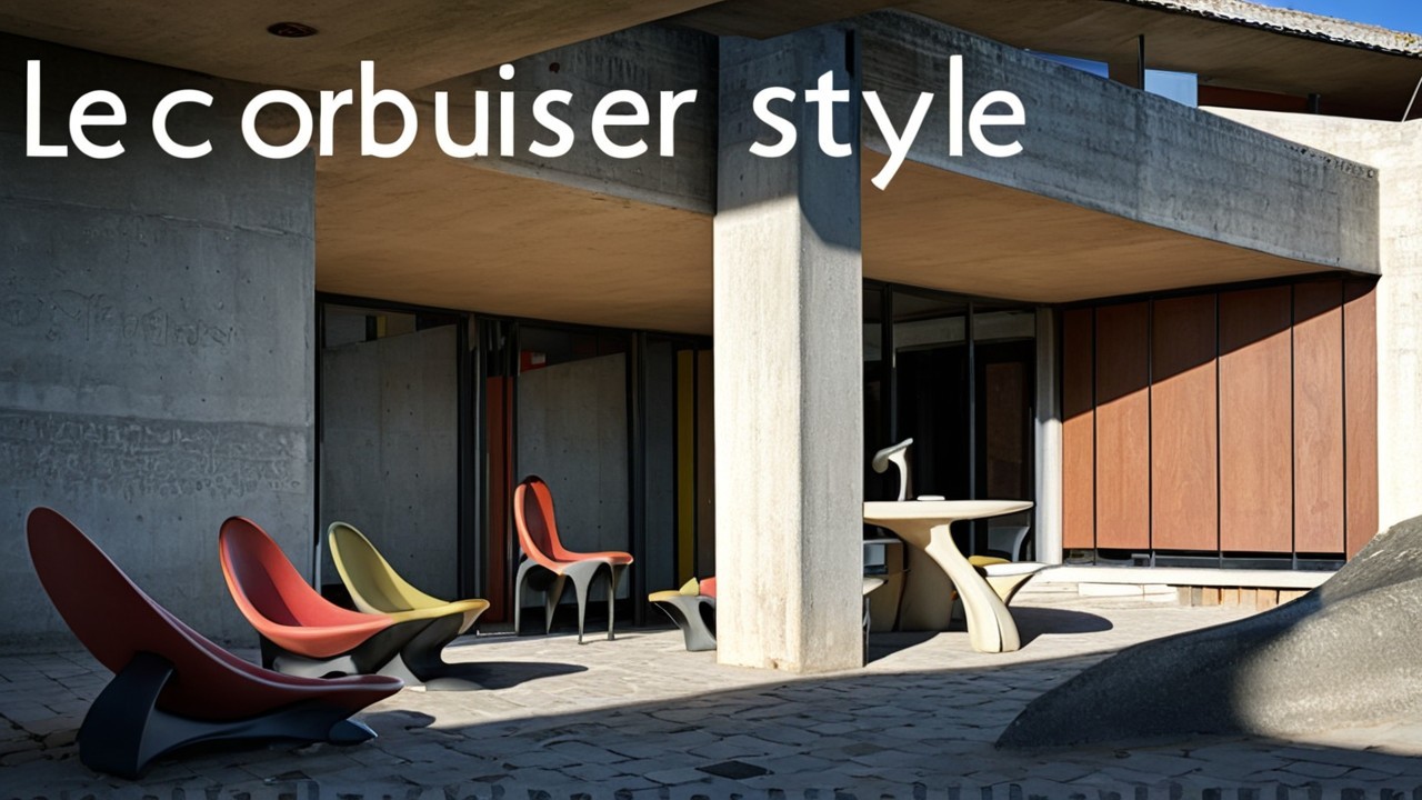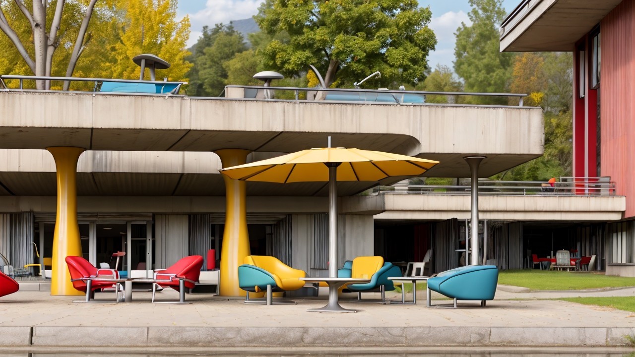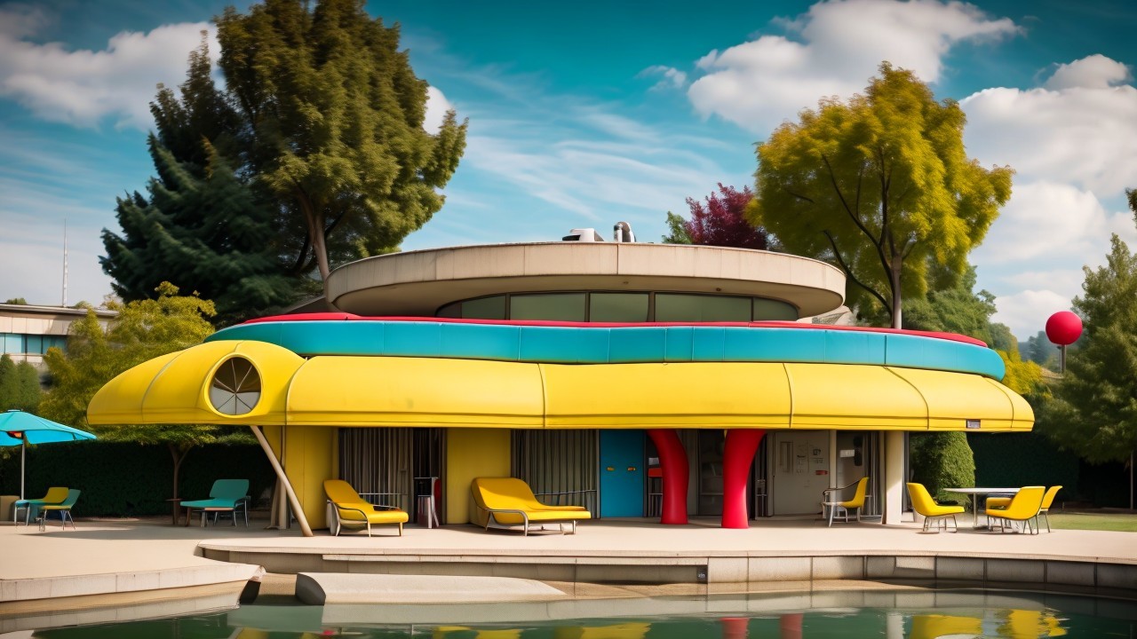 A modern, colorful house features a curved yellow and blue facade with red pillars. Lounge chairs in bright colors line the edge of a serene pool, surrounded by lush greenery under a clear blue sky.
