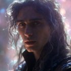 Close-up portrait of a male cosmic sorcerer, his graying long hair flowing around his shoulders, with fair skin and light green/blue eyes, dressed in an ornate deep blue and purple garment adorned with golden filigree and glowing blue lights.