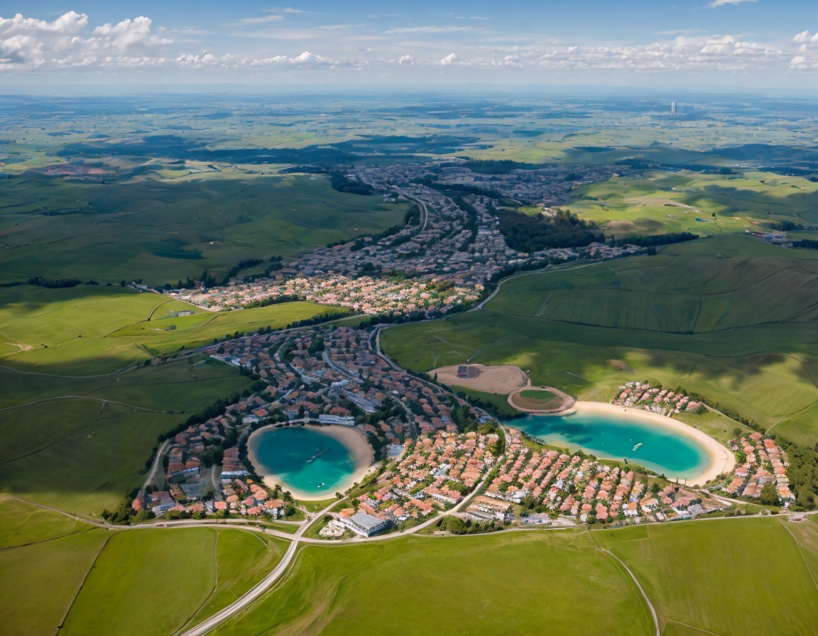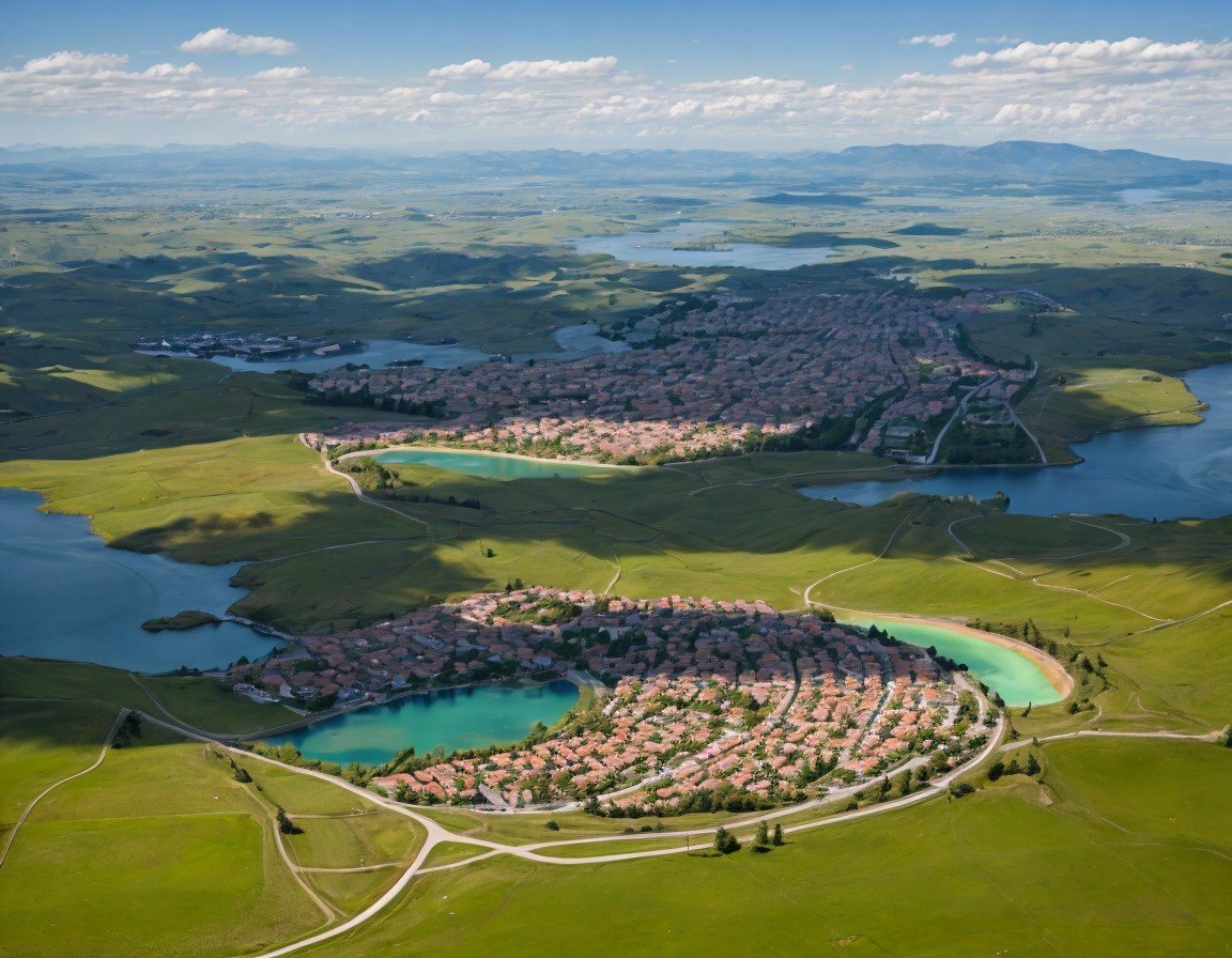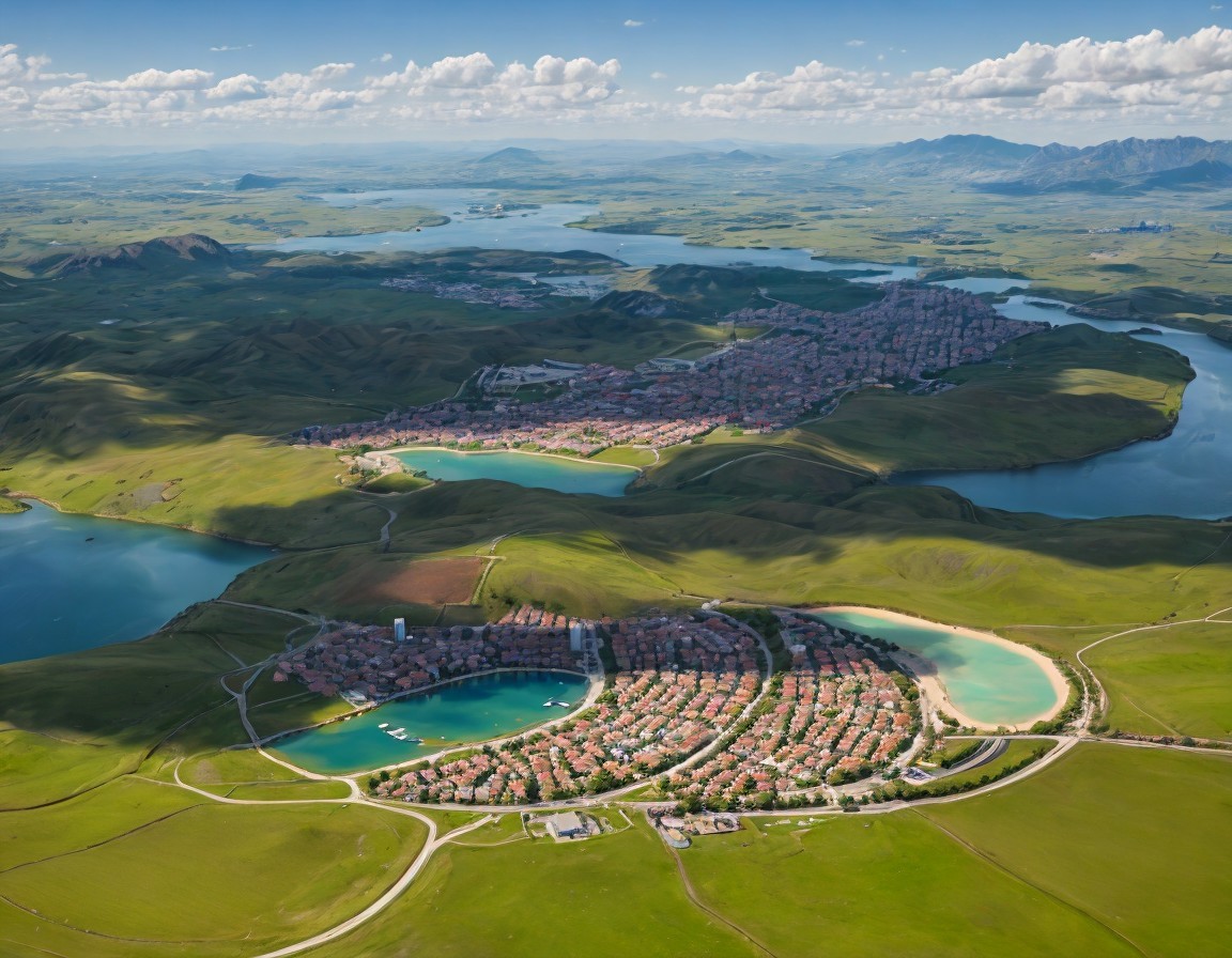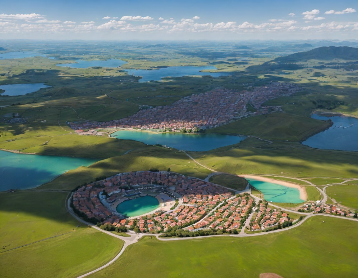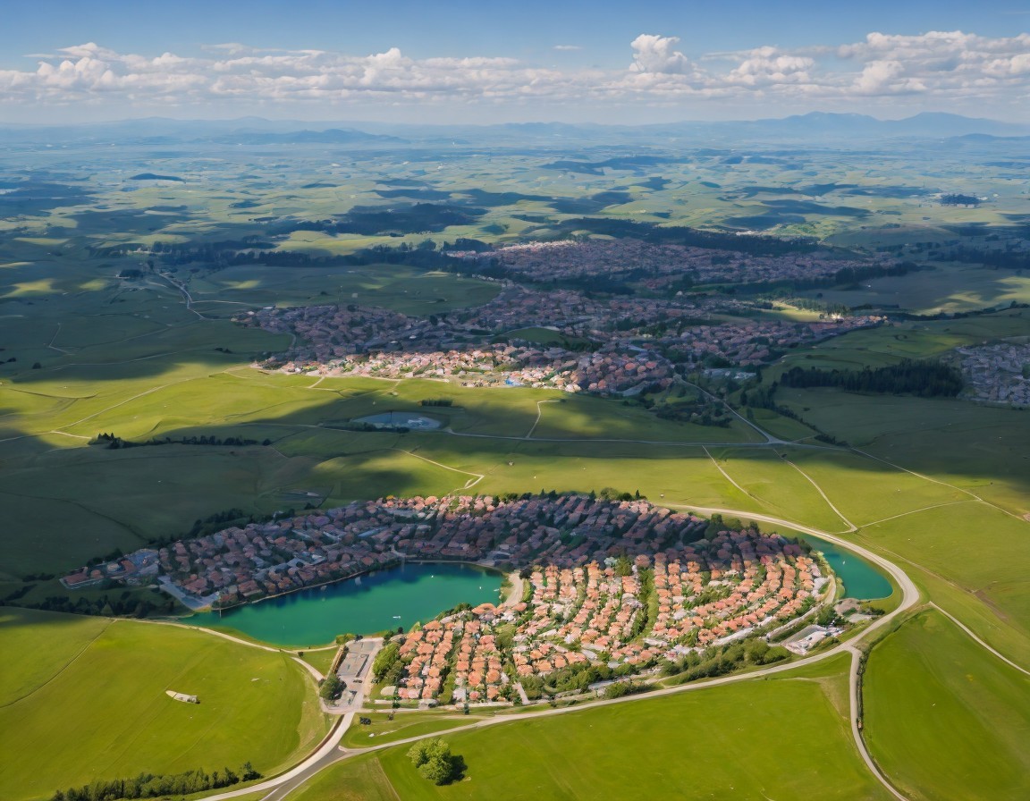 Aerial view of a lush green landscape featuring a circular reservoir surrounded by a sprawling residential area. Nearby, rolling hills stretch into the distance under a clear blue sky.