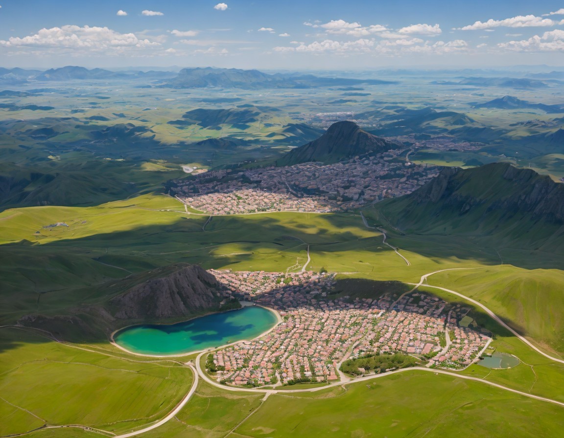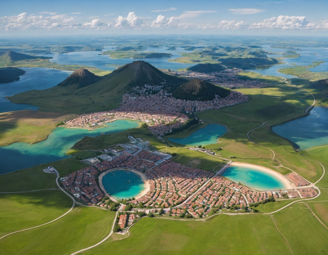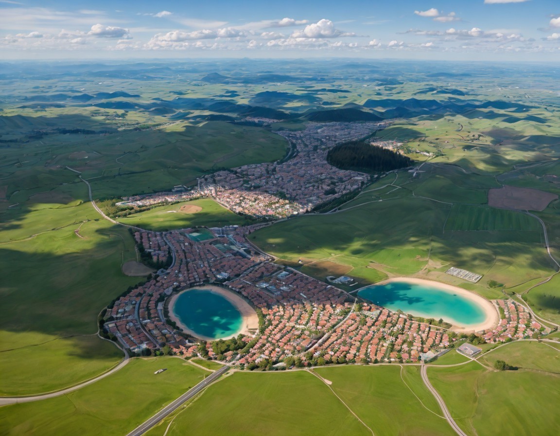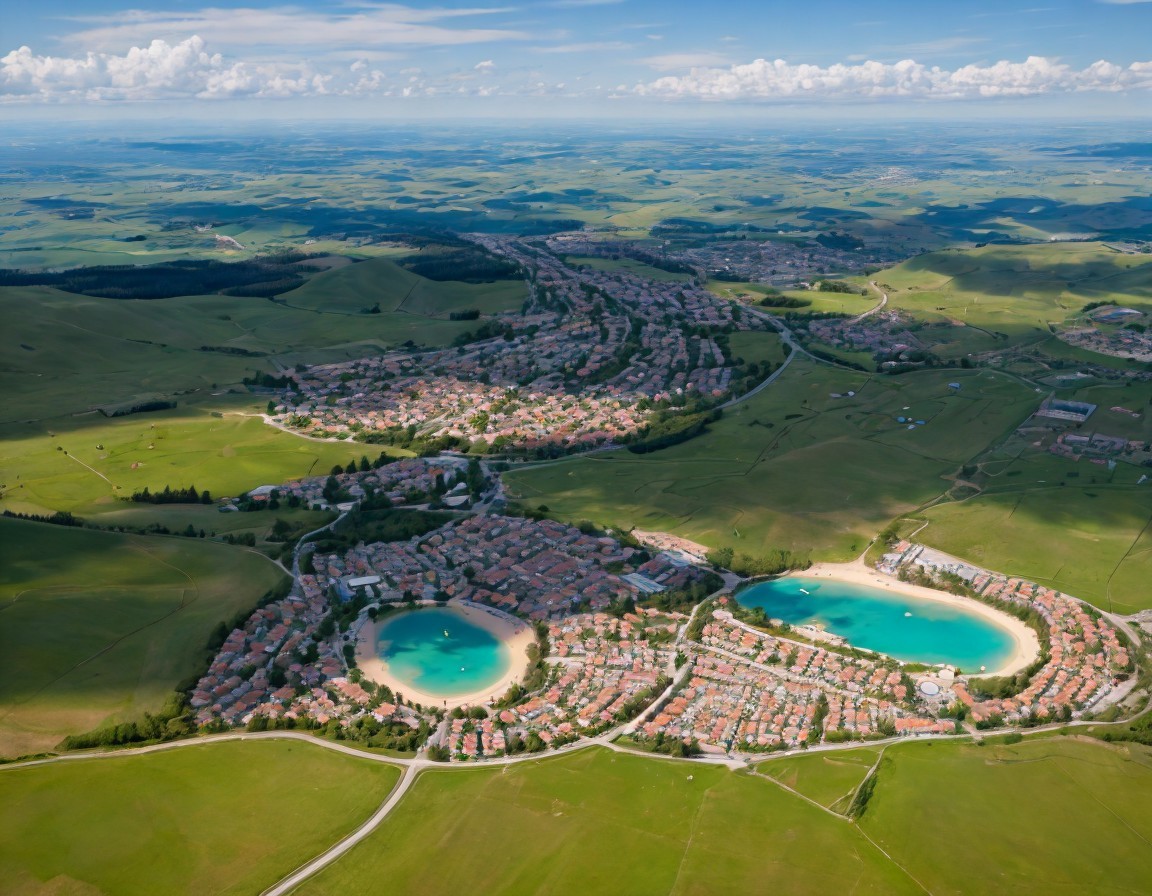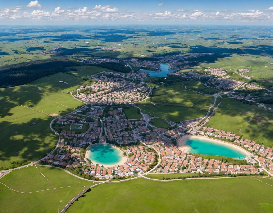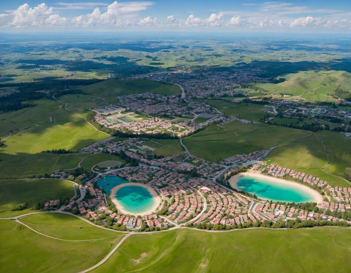 Aerial view of a lush green landscape featuring a circular reservoir surrounded by a sprawling residential area. Nearby, rolling hills stretch into the distance under a clear blue sky.