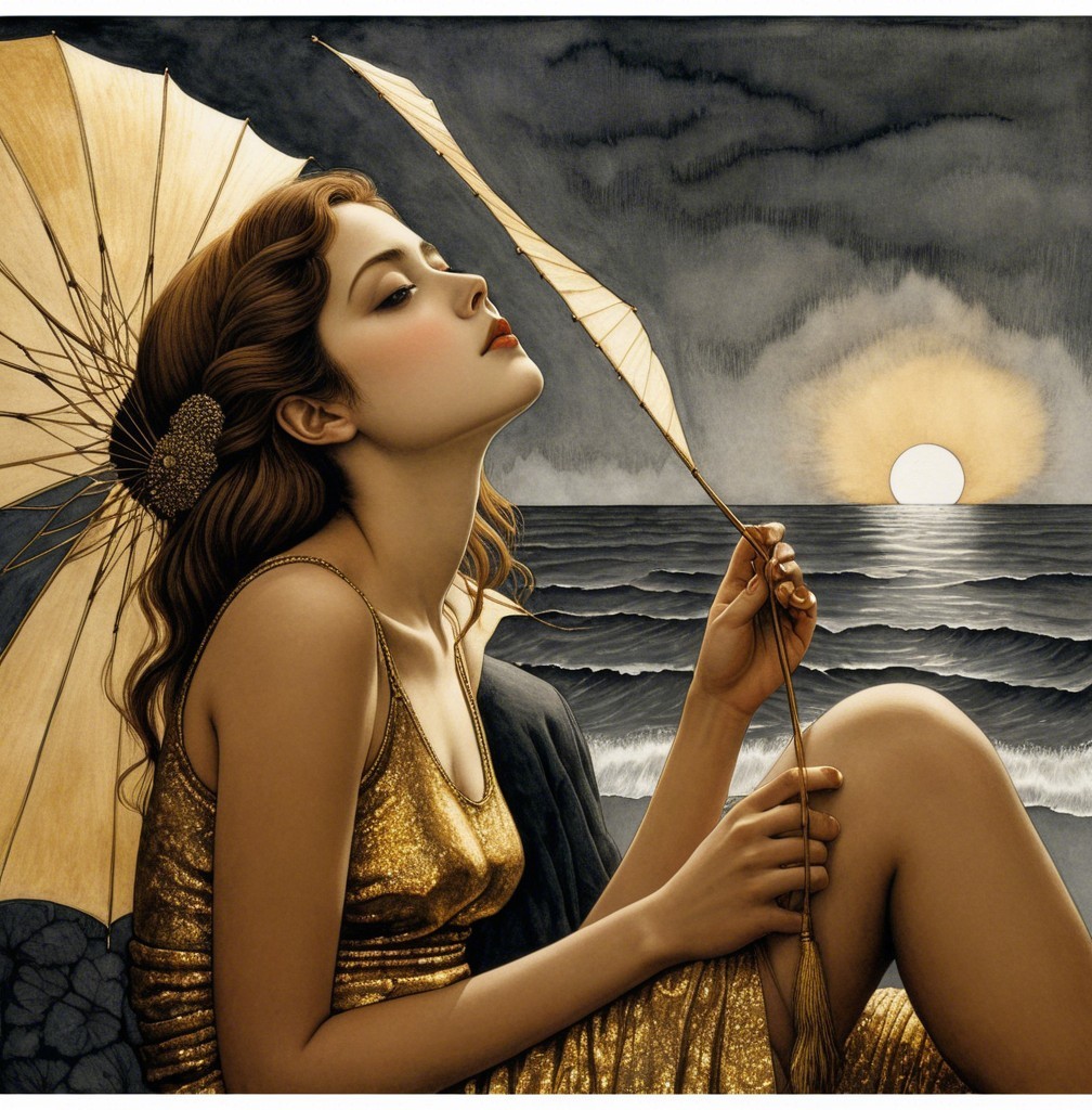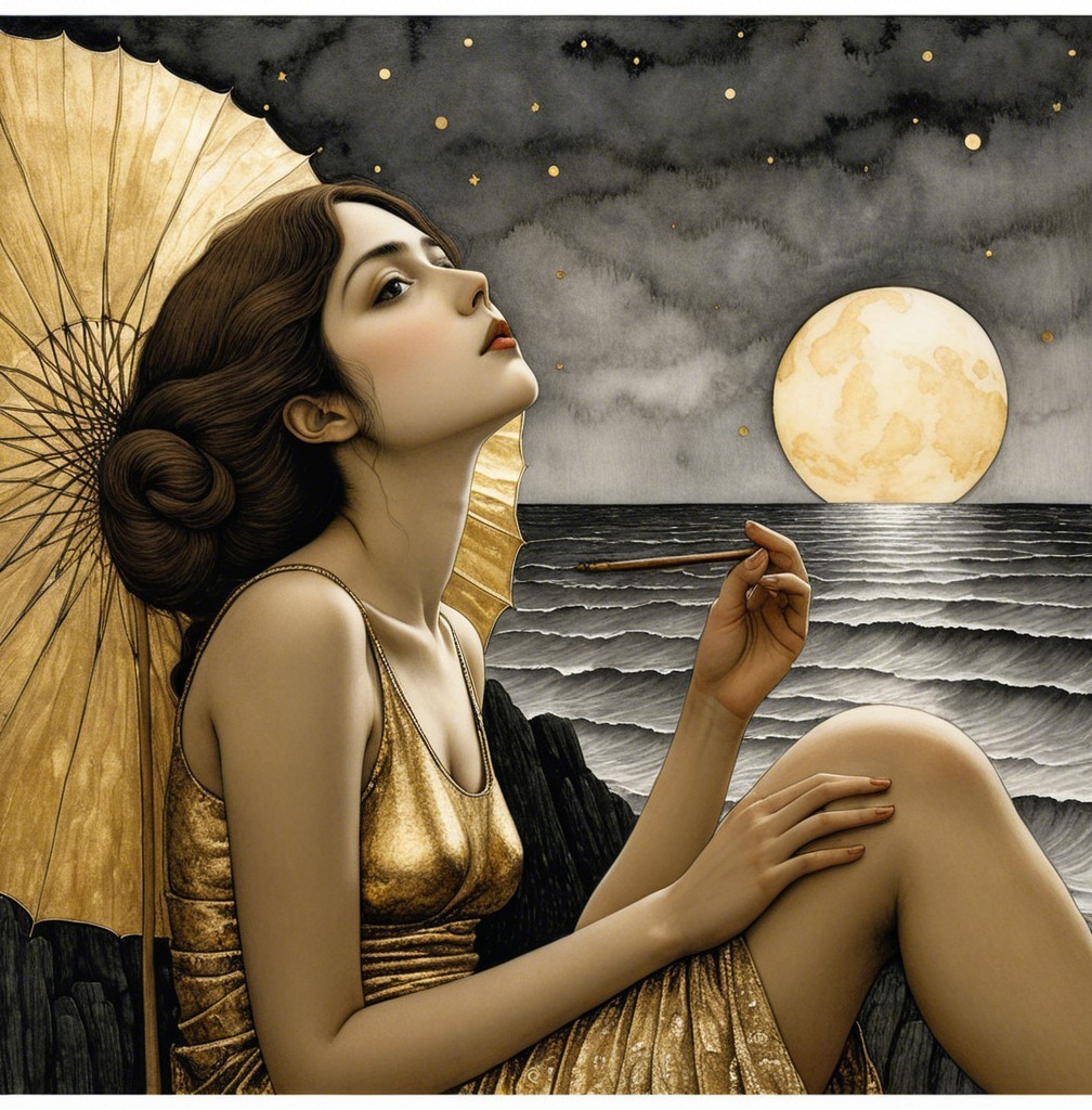 A girl with flowing hair and a golden parasol gazes thoughtfully towards a moonlit sea. The dramatic sky and rocky shoreline create a mystical, serene atmosphere.
