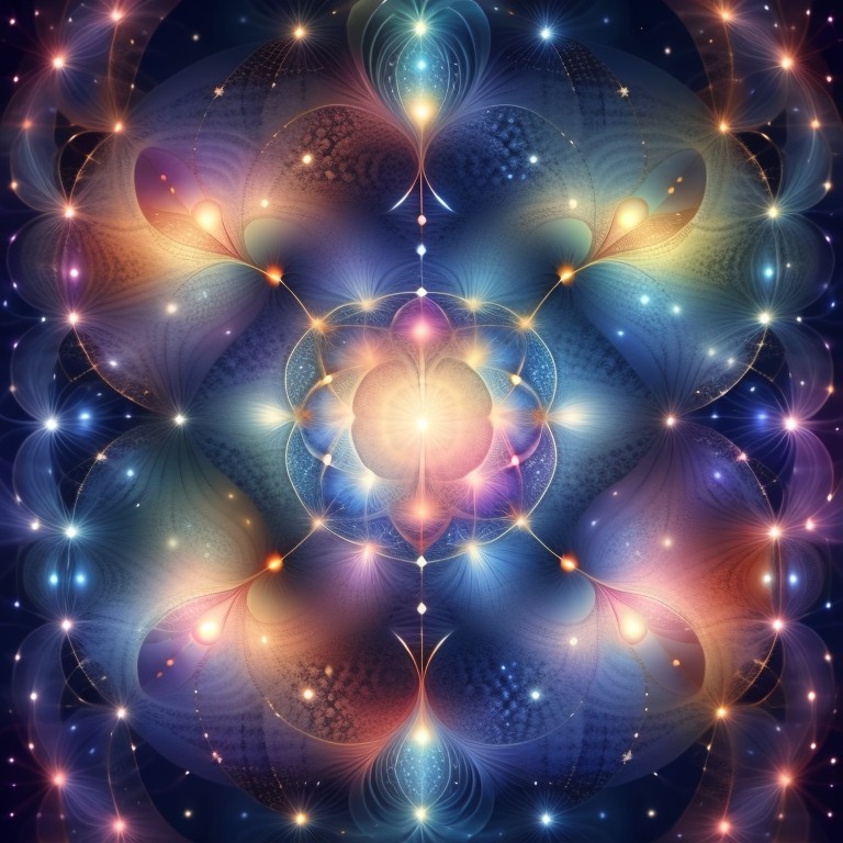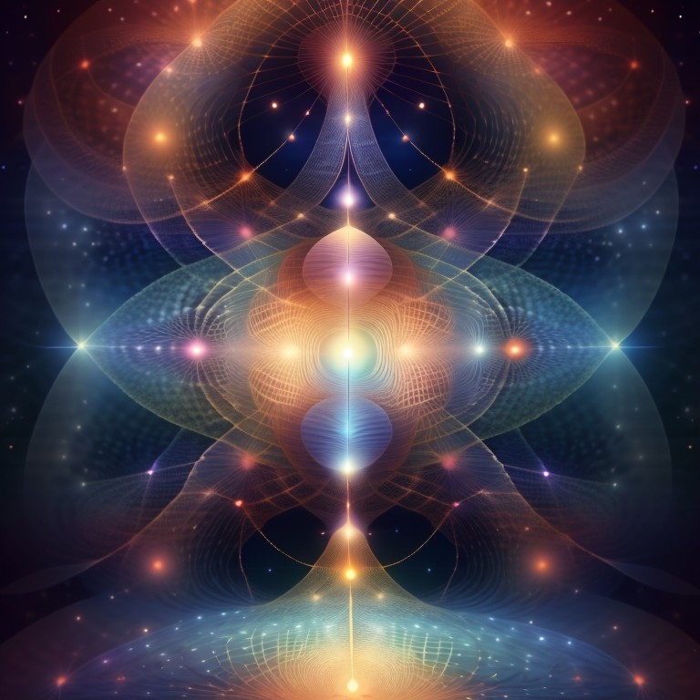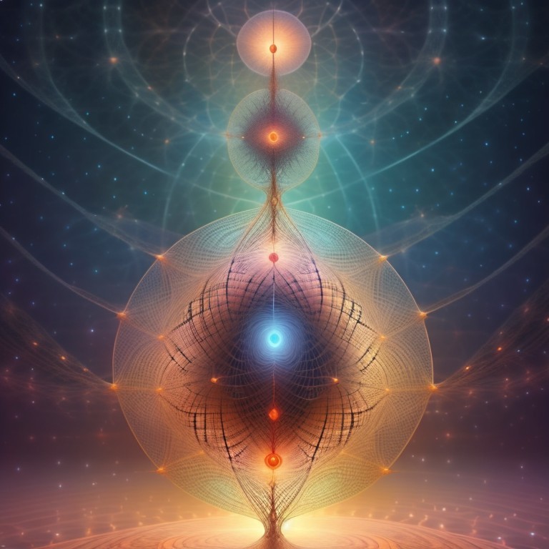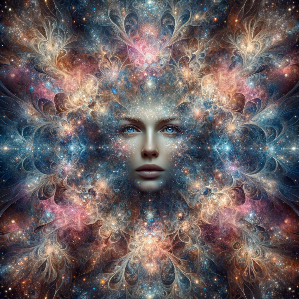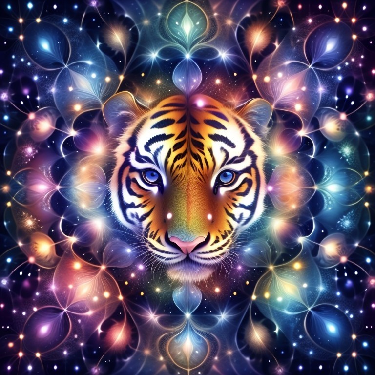 A majestic tiger amidst a psychedelic, colorful cosmic background with glowing orbs and fractal patterns.