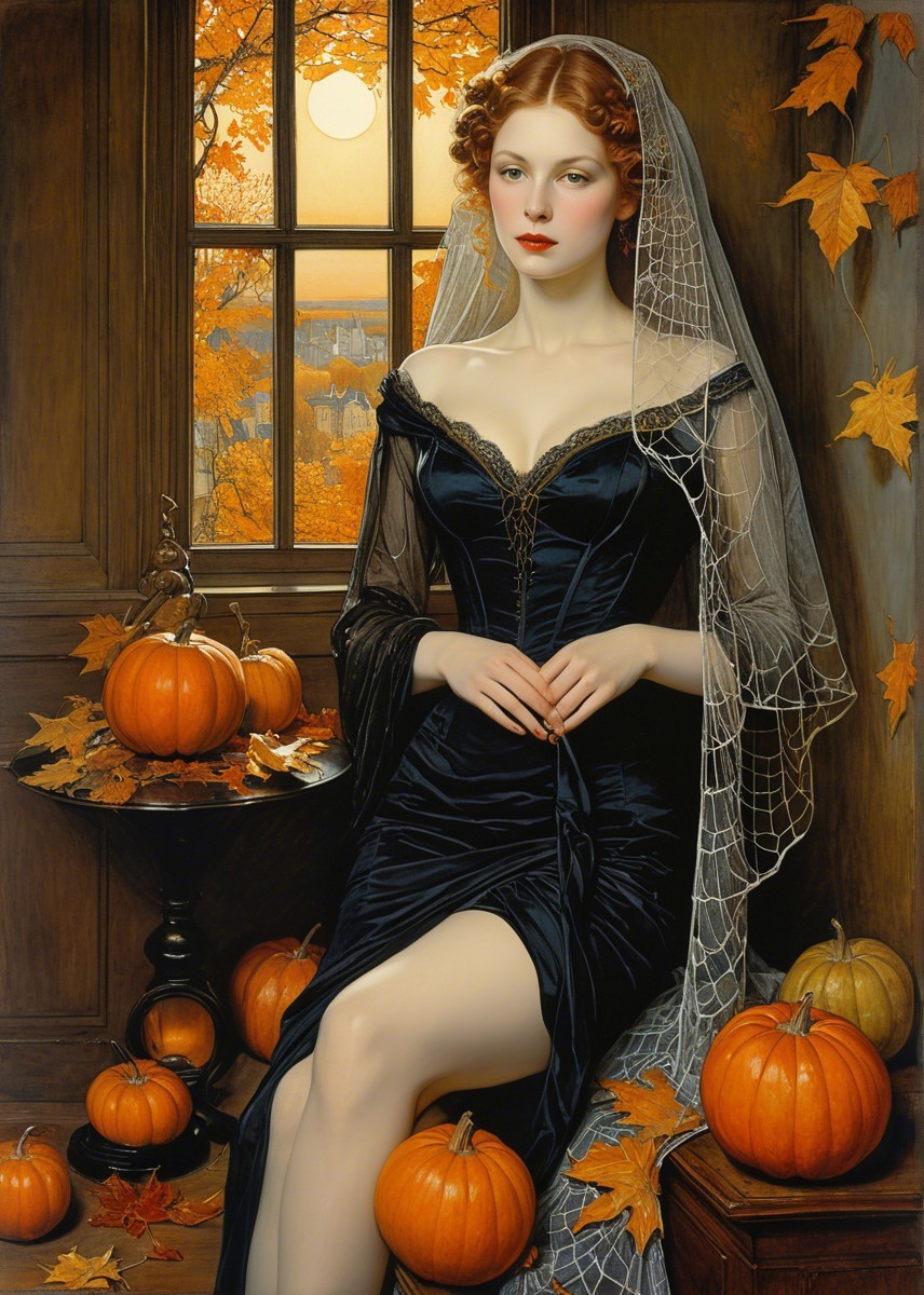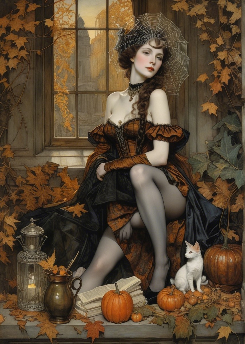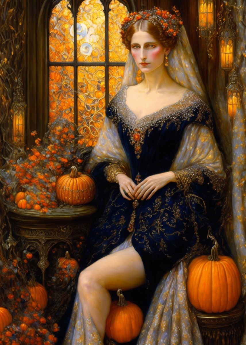A woman in a dark blue dress sits among pumpkins and autumn leaves, framed by a window with a spiderweb. The warm hues of fall create a mystical, enchanting atmosphere.