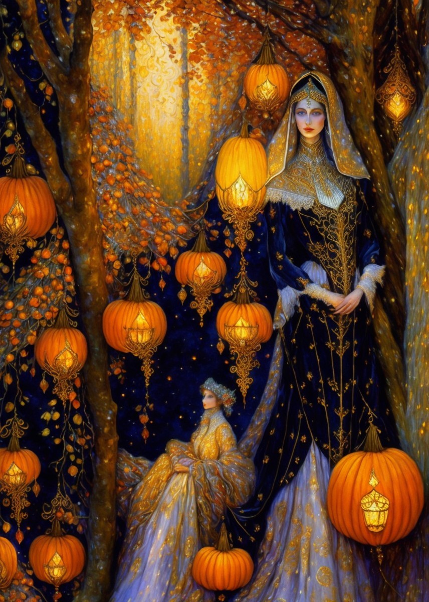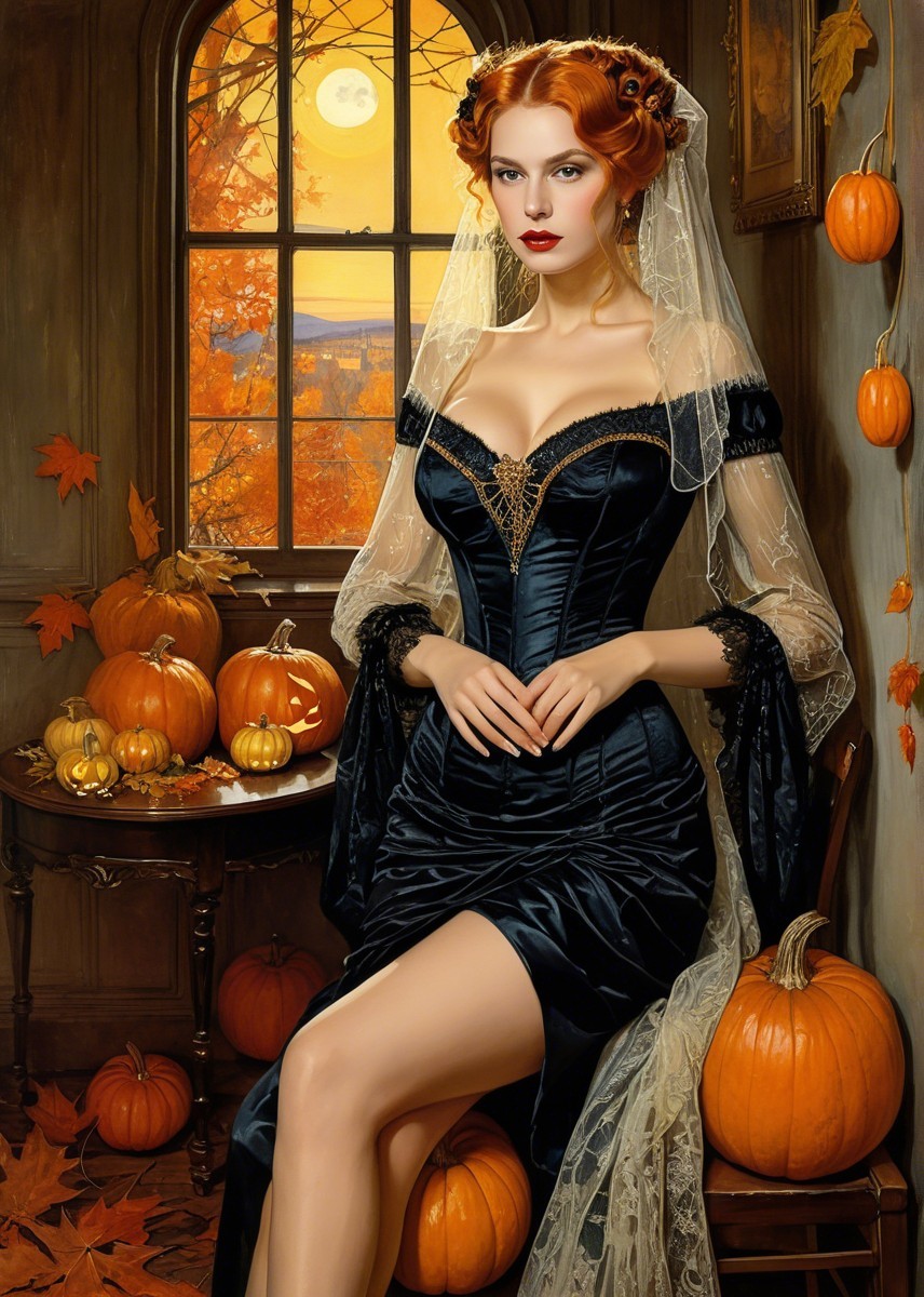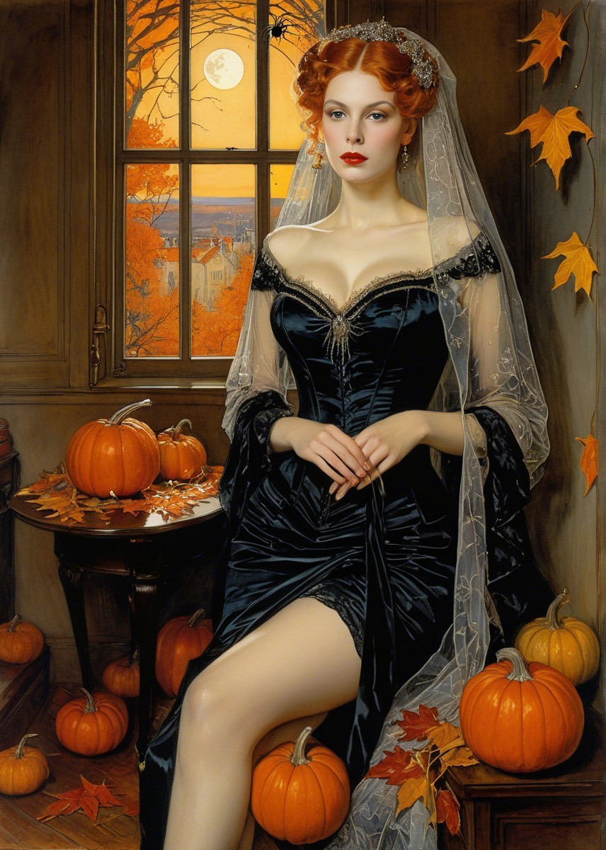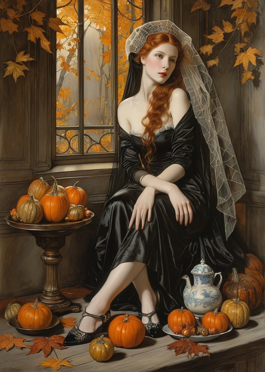 A woman in a dark blue dress sits among pumpkins and autumn leaves, framed by a window with a spiderweb. The warm hues of fall create a mystical, enchanting atmosphere.