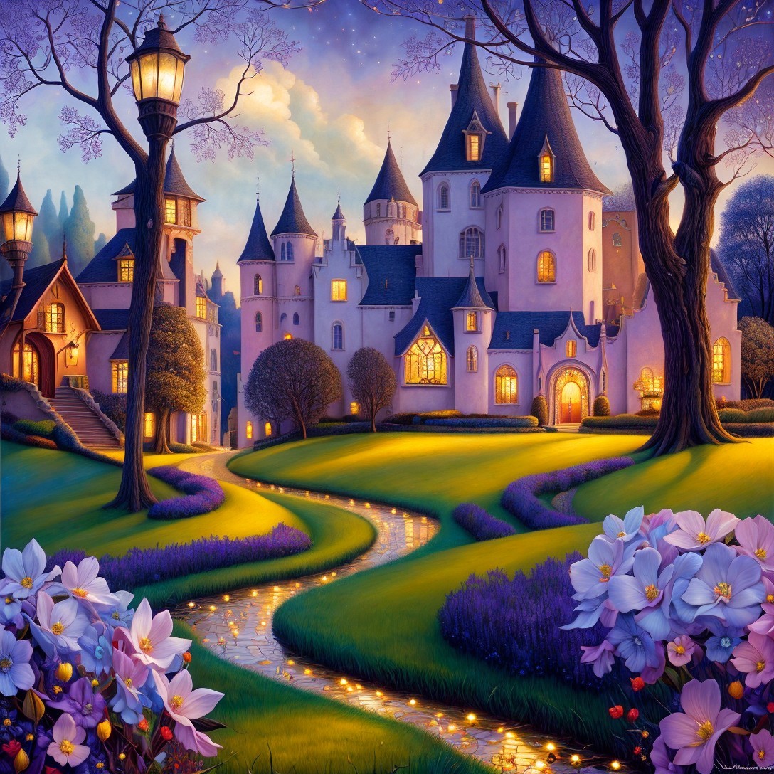 A vibrant, whimsical painting of a fairy-tale village with charming houses, illuminated lamps, a winding river, and lush, colorful flora under a twilight sky.