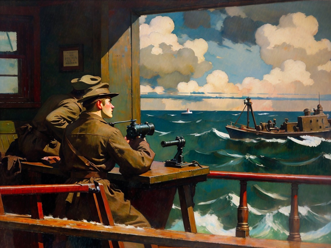 Two soldiers stand in a coastal lookout, using binoculars and a machine gun, observing a vibrant ocean scene with boats and planes under a bright, cloudy sky. The room has a vintage feel.