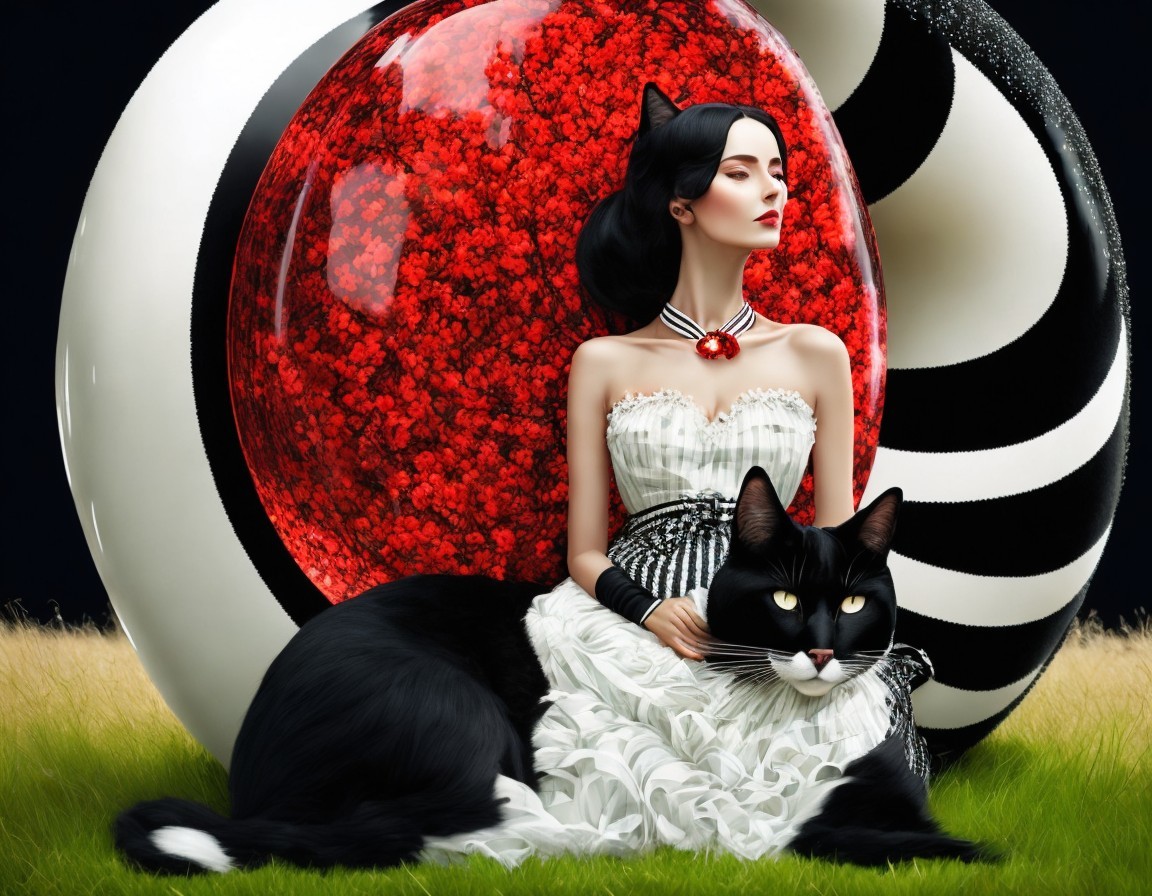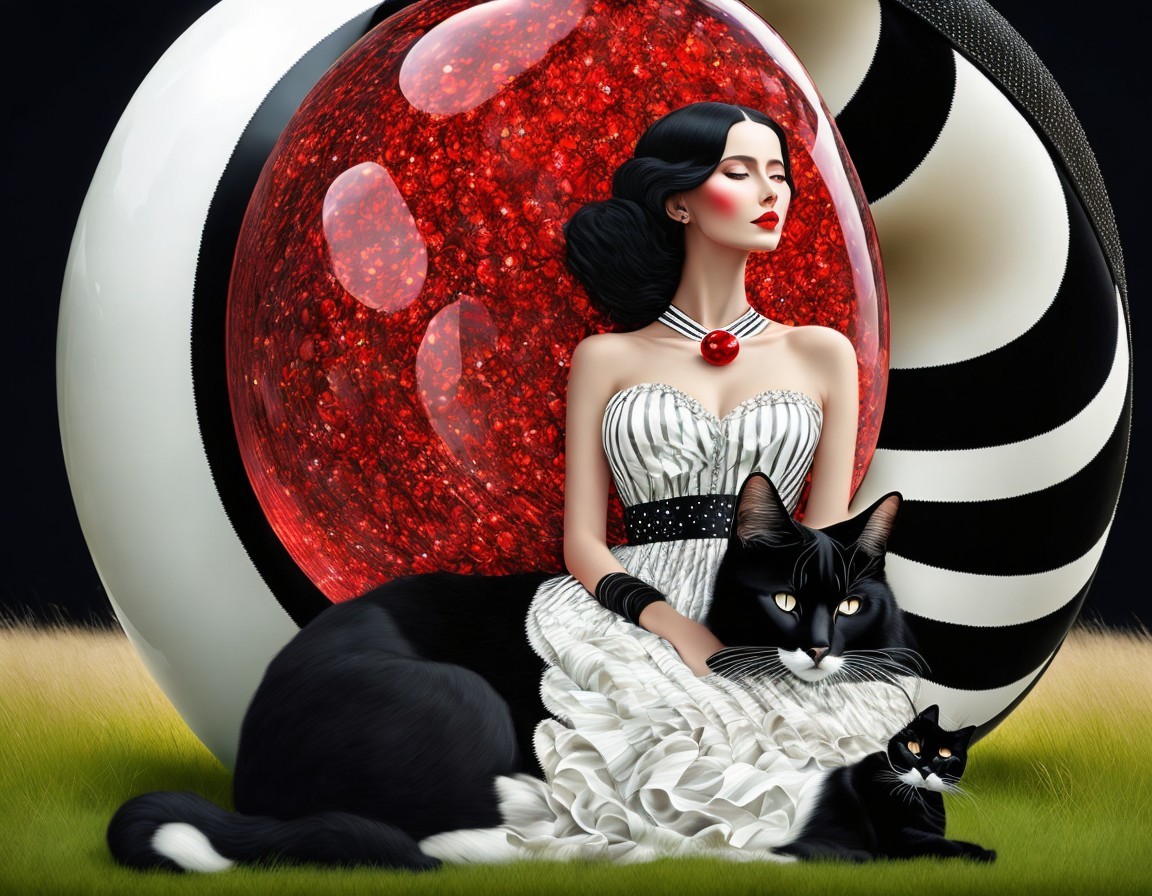 A stylish woman in a striped dress sits elegantly beside two cats, framed by a large orb filled with red bubbles. The scene blends whimsy with surrealism against a dark background.