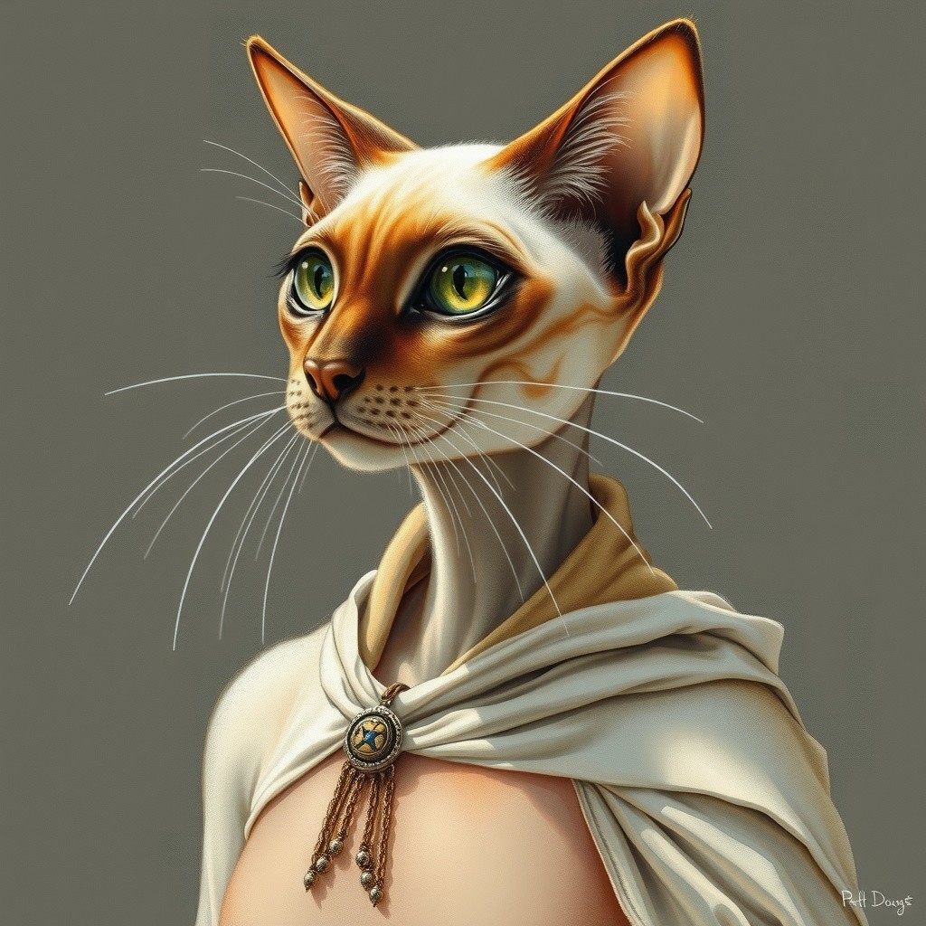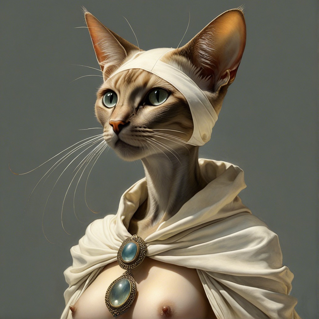 A surreal image of a cat with a human-like body dressed elegantly in a white blouse and adorned with a sophisticated jewel necklace.