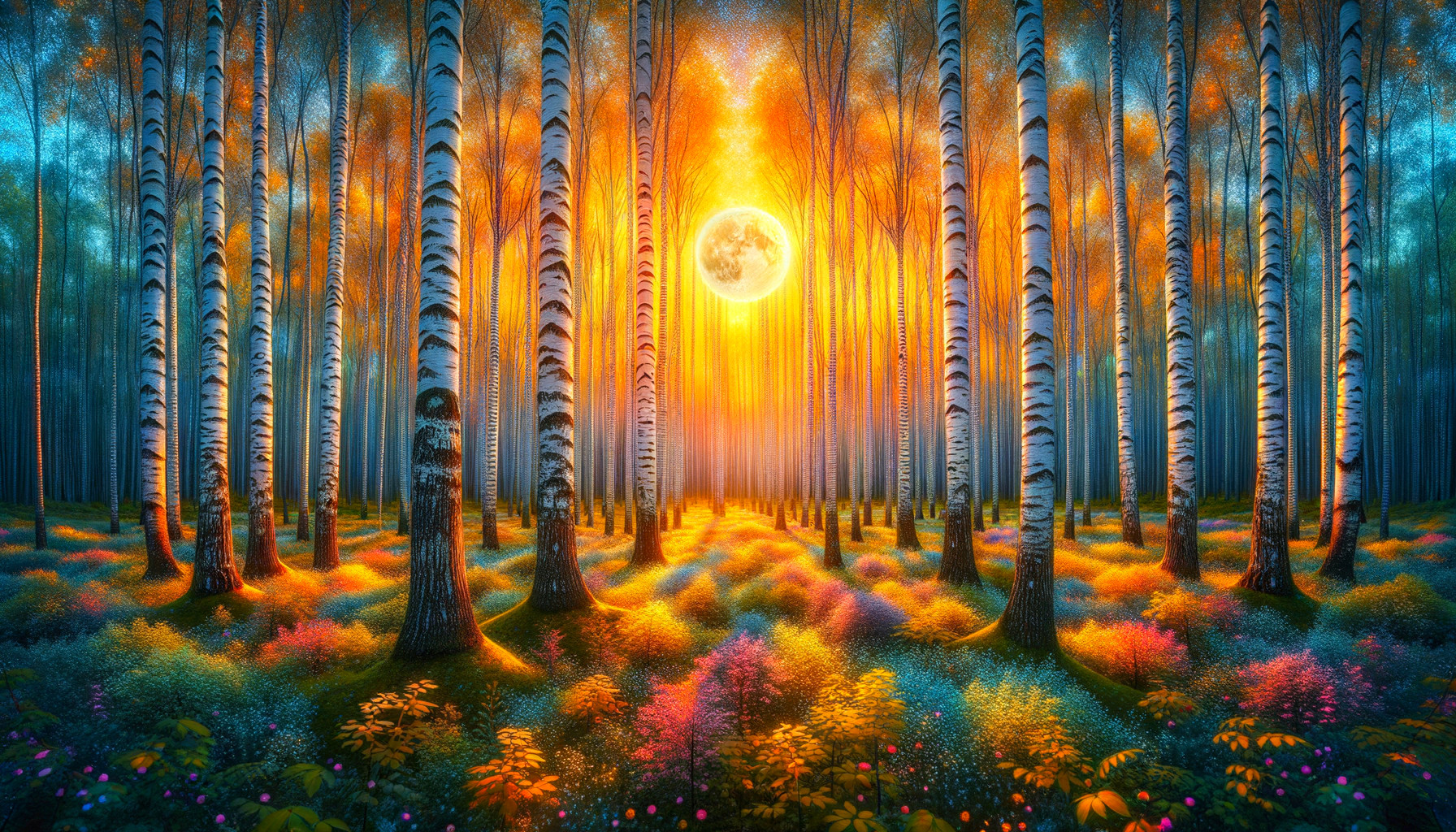 A vibrant, colorful forest scene with sunlight piercing through birch trees illuminating diverse flora and a large moon visible in the sky.