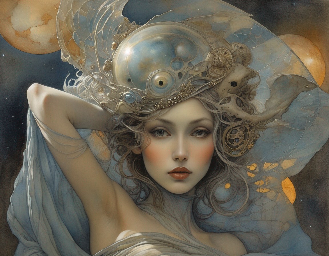 A woman with intricate, cosmic-themed headgear sits before a moon backdrop, her expression serene, embodying a celestial aura.